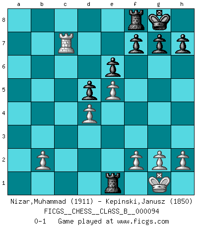 Last move : 0-1 2010 May 28 8:39:56 [Event "FICGS__CHESS__CLASS_B__000094"] [Site "FICGS"] [Date "2009.12.20"] [Round "1"] [White "Nizar,Muhammad"] [Black "Kepinski,Janusz"] [Result "0-1"] [WhiteElo "1911"] [BlackElo "1850"] 1.d4 Nf6 2.c4 e6 3.Nf3 Bb4+ 4.Bd2 Bxd2+ 5.Qxd2 O-O 6.Nc3 c6 7.e4 b5 8.cxb5 d5 9.e5 cxb5 10.Bxb5 Ne4 11.Qe2 Qa5 12.Rc1 Nxc3 13.Rxc3 Qxa2 14.O-O Qa5 15.Rfc1 Bd7 16.Rc5 Bxb5 17.Qxb5 Qxb5 18.Rxb5 Nd7 19.Rb7 Nb8 20.R1c7 Na6 21.Rxa7 Nxc7 22.Rxc7 Ra1+ 23.Ne1 Rxe1+ 0-1 This chess game has been lost on time (started : 2009.12.20 18:39:47) Bogo-Indian defense Kingside Castling by player Black (move 5) Kingside Castling by player White (move 14) Player Black won this chess game. Follow this game move after move (download)Chess makes man wiser and clear-sighted. (Vladimir Putin) Bobby Fischer ist kein Vorbild für die heutige Jugend. (Viktor Kortschnoi) Ciertamente el estado mental actual de Bobby Fischer es una tragedia. Uno de los mas grandes jugadores de Ajedrez del mundo -el orgullo y pena del Ajedrez Americano. (Frank Brady) Botvinnik disait en comparant les échecs à la musique: Il existe une science dont le but est l'étude de l'acoustique et des sons. Mais il y a aussi un art qui se sert de l'océan des sons : c'est la musique. De toute évidence, il en est de même pour la pensée. La logique est l'étude des lois de la réflexion et les échecs reflètent, en tant qu'art, le côté logique de la réflexion, sous la forme d'images artistiques... Extrait de Fischer - Spassky, Reykjavik 1972 par Alexander & F. Wyndham (Ed. Solar), p 37. A good programmer is someone who always looks both ways before crossing a one-way street. (Doug Linder)