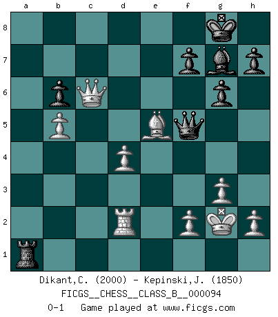 Last move : 0-1 2010 August 29 10:51:35 [Event "FICGS__CHESS__CLASS_B__000094"] [Site "FICGS"] [Date "2009.12.20"] [Round "1"] [White "Dikant,Christophe"] [Black "Kepinski,Janusz"] [Result "0-1"] [WhiteElo "2000"] [BlackElo "1850"] 1.c4 g6 2.g3 Bg7 3.Bg2 Nf6 4.Nc3 e6 5.e3 c5 6.Nge2 O-O 7.O-O Nc6 8.d4 cxd4 9.exd4 d5 10.cxd5 Nxd5 11.Nxd5 exd5 12.Be3 Re8 13.Nc3 Be6 14.a3 a6 15.Na4 Qf6 16.Qb3 Qe7 17.Nb6 Rad8 18.Rfd1 Na5 19.Qc3 Nc6 20.b4 Na7 21.Qb3 Rd6 22.Na4 Nb5 23.Nc5 Bg4 24.Rd2 b6 25.Na4 Qe6 26.Rc1 Bh3 27.Bxh3 Qxh3 28.Nc3 Rc8 29.Ne2 Rdc6 30.Rxc6 Rxc6 31.Qxd5 Qc8 32.a4 Nc3 33.Nxc3 Rxc3 34.Kg2 Bf8 35.b5 axb5 36.axb5 Ra3 37.Qc6 Qf5 38.Bf4 Ra1 39.Be5 Bg7 0-1 This chess game has been lost on time (started : 2009.12.20 18:39:47) English Opening Kingside Castling by player Black (move 6) Kingside Castling by player White (move 7) Player Black won this chess game. Follow this game move after move (download)A passed Pawn increases in strength as the number of pieces on the board diminishes. (Capablanca) Vom Schach wurde gesagt das Leben sei dafür nicht lange genug. Aber das ist der Fehler des Lebens, nicht des Schach'. (Irving Chernev) Durante una competencia de Ajedrez, un Maestro de Ajedrez deberá ser una combinación de presa de caza y un Monge. (Alexander Alekhine) La menace est plus forte que l'exécution. (Aaron Nimzovitch) Mandala - that's it! 16x16 squares as multiple of the four and the eight because of the Four Noble Truths and the Noble Eightfold Path. (Heinz-Georg Lehnhoff about Big Chess)