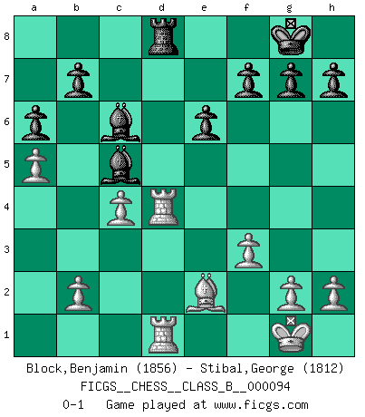 Last move : 0-1 2010 March 18 20:38:56 [Event "FICGS__CHESS__CLASS_B__000094"] [Site "FICGS"] [Date "2009.12.20"] [Round "1"] [White "Block,Benjamin"] [Black "Stibal,George"] [Result "0-1"] [WhiteElo "1856"] [BlackElo "1812"] 1.e4 c5 2.Nf3 d6 3.d4 cxd4 4.Nxd4 Nf6 5.Nc3 a6 6.Be3 e6 7.a4 Be7 8.Be2 O-O 9.O-O Bd7 10.a5 Nc6 11.Nxc6 Bxc6 12.f3 d5 13.exd5 Nxd5 14.Nxd5 Bxd5 15.c4 Bc6 16.Bb6 Qb8 17.Qd2 Qe5 18.Qd4 Qxd4+ 19.Bxd4 Rfd8 20.Rfd1 Rxd4 21.Rxd4 Bc5 22.Rad1 Rd8 0-1 Sicilian : Najdorf, Byrne (English) attack Kingside Castling by player Black (move 8) Kingside Castling by player White (move 9) Player Black won this chess game. Follow this game move after move (download)Bobby is the finest Chess player this country ever produced. His memory for the moves, his brilliance in dreaming up combinations, and his fierce determination to win are uncanny. (John Collins) Die Auseinandersetzung mit Karpow war politisch geprägt. Er stand für das kommunistische System, wurde von dessen Repräsentanten gehätschelt. Ich war der Oppositionelle. Jeder Schachweltmeister spiegelt auch die gesellschaftlichen Verhältnisse wider. Kramnik steht für die Börsen-Generation des Neuen Markts, ideologiefrei, zahlenfixiert. (Garry Kasparov) El Ajedrez es parte de la cultura, y si una cultura esta en decadencia, entonces también el Ajedrez declinará. (Mikhail Botvinnik) Soyez une menace à chaque fois que vous vous asseyez pour jouer. (Ken Smith) They say in chess you've got to kill the queen, and then you mate it... Oh I, do you ? (Red Hot Chili Peppers, Fortune faded)