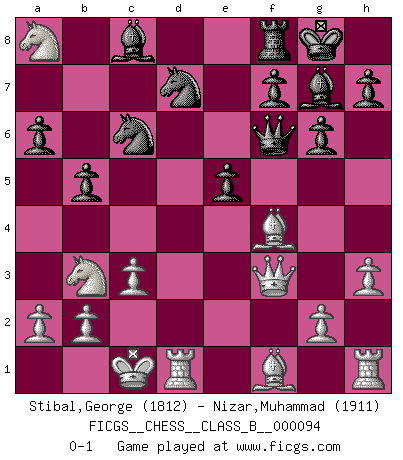 Last move : 0-1 2010 April 23 2:10:10 [Event "FICGS__CHESS__CLASS_B__000094"] [Site "FICGS"] [Date "2009.12.20"] [Round "1"] [White "Stibal,George"] [Black "Nizar,Muhammad"] [Result "0-1"] [WhiteElo "1812"] [BlackElo "1911"] 1.e4 c5 2.Nf3 d6 3.d4 cxd4 4.Nxd4 Nf6 5.Nc3 a6 6.f4 Qb6 7.Nb3 g6 8.Qf3 Bg7 9.h3 Nc6 10.Be3 Qc7 11.O-O-O b5 12.e5 dxe5 13.fxe5 Nd7 14.Nd5 Qxe5 15.c3 O-O 16.Bf4 Qe6 17.Nc7 Qf6 18.Nxa8 e5 0-1 Sicilian : Najdorf, 6.f4 Queenside Castling by player White (move 11) Kingside Castling by player Black (move 15) Player Black won this chess game. Follow this game move after move (download)The most powerful weapon in Chess is to have the next move. (David Bronstein) Ich organisiere ein großes Turnier, was mich etwa 120000 Dollar kostet. Ich denke, das ist das erste Mal in der Schachgeschichte, daß ein Schachgroßmeister auch als Mäzen auftritt. (Miguel Najdorf) Las piezas de Ajedrez son los bloques del alfabeto que moldean los pensamientos; y esos pensamientos, aunque hagan un diseño visual en el tablero, expresan abstractamente su belleza como un poema. (Marcel Duchamp) Les échecs sont un jeu terrible. Si vous n'avez pas le centre, votre adversaire a une position plus libre. Par contre, si vous avez le centre, alors vous avez vraiment quelque chose pour laquelle vous inquiéter ! (Siegbert Tarrasch) Warrior pose battles inner weakness and wins focus. You see that there is no war within you. You're on your own side, and you are your own strength. (Terri Guillemets)