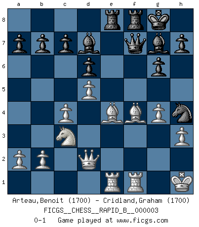 Last move : 0-1 2006 July 12 13:25:48 [Event "FICGS__CHESS__RAPID_B__000003"] [Site "FICGS"] [Date "2006.04.23"] [Round "1"] [White "Arteau,Benoit"] [Black "Cridland,Graham"] [Result "0-1"] [WhiteElo "1700"] [BlackElo "1700"] 1.d4 Nf6 2.c4 g6 3.g3 Bg7 4.Bg2 O-O 5.e4 d6 6.Nc3 Nc6 7.Nge2 e5 8.d5 Ne7 9.f4 Nh5 10.Be3 f5 11.O-O exf4 12.Nxf4 Nxf4 13.Bxf4 fxe4 14.Bxe4 Nf5 15.Kh1 Bd7 16.Qd2 Qe7 17.Rae1 Qf7 18.g4 Nh4 19.h3 Rae8 0-1 This chess game has been lost on time (started : 2006.04.23 16:33:7) King's Indian : 3.g3 Kingside Castling by player Black (move 4) Kingside Castling by player White (move 11) Player Black won this chess game. Follow this game move after move (download)When you don't know what to do, wait for your opponent to get an idea - it's sure to be wrong. (Tarrasch) Offensichtlich kennt Kasparow nichts anderes als Schach, und ich könnte 500 weitere Spieler dieser Sorte benennen. (Judith Polgar) Con o sin el título, Bobby Fischer fue sin lugar a dudas el mas grande jugador de su época. (Burt Hochberg) Fischer est le meilleur joueur du monde et Karpov n'est qu'un joueur de bistrot. (Garry Kasparov, agé de 16 ans) Men should grow up. - Yeah. And dogs should stop licking themselves. It's not gonna happen. (Gregory House to Dr. Cameron, House M.D.)