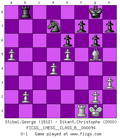 Last move : 0-1 2010 April 24 21:25:19 [Event "FICGS__CHESS__CLASS_B__000094"] [Site "FICGS"] [Date "2009.12.20"] [Round "1"] [White "Stibal,George"] [Black "Dikant,Christophe"] [Result "0-1"] [WhiteElo "1812"] [BlackElo "2000"] 1.e4 g6 2.d4 Bg7 3.Nc3 c6 4.Be3 d5 5.f3 dxe4 6.fxe4 Nf6 7.Nf3 O-O 8.Qd2 b5 9.a3 Bb7 10.h3 a5 11.e5 Nd5 12.Nxd5 Qxd5 13.Rc1 e6 14.c4 Qd7 15.Be2 Na6 16.cxb5 cxb5 17.Qxa5 Bc6 18.Qb6 Nb8 19.O-O Rc8 20.Bxb5 Bf8 21.a4 Be7 22.Ng5 Bd8 23.Qc5 Na6 24.Bxc6 Bxg5 25.Bxg5 Nxc5 26.Bxd7 Nxd7 27.Rxc8+ Rxc8 28.a5 Rb8 0-1 Robatsch defense Kingside Castling by player Black (move 7) Kingside Castling by player White (move 19) Player Black won this chess game. Follow this game move after move (download)Blessed be the memory of him who gave the world this immortal game. (A. G. Gardiner) Offensichtlich kennt Kasparow nichts anderes als Schach, und ich könnte 500 weitere Spieler dieser Sorte benennen. (Judith Polgar) Los asuntos humanos son como una partida de Ajedrez: solo aquellos que no lo toman seriamente, pueden ser llamados buenos jugadores. (Hung Tzu Ch'eng) Fischer est le meilleur joueur du monde et Karpov n'est qu'un joueur de bistrot. (Garry Kasparov, agé de 16 ans) You can think I'm wrong, but that's no reason to quit thinking. (Gregory House, House M.D.)