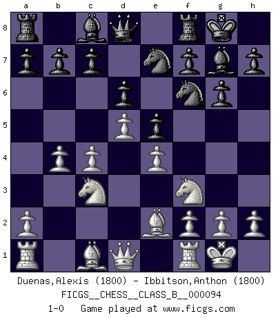 Last move : 1-0 2010 January 30 20:40:8 [Event "FICGS__CHESS__CLASS_B__000094"] [Site "FICGS"] [Date "2009.12.20"] [Round "1"] [White "Duenas,Alexis"] [Black "Ibbitson,Anthon"] [Result "1-0"] [WhiteElo "1800"] [BlackElo "1800"] 1.d4 Nf6 2.c4 g6 3.Nc3 Bg7 4.e4 d6 5.Nf3 O-O 6.Be2 e5 7.O-O Nc6 8.d5 Ne7 9.b4 1-0 This chess game has been lost on time (started : 2009.12.20 18:39:47) King's Indian : Orthodox, Aronin-Taimanov variation (Yugoslav attack / Mar del Plata variation) Kingside Castling by player Black (move 5) Kingside Castling by player White (move 7) Player White won this chess game. Follow this game move after move (download)Mistrust is the most necessary characteristic of the Chess player. (Siegbert Tarrasch) Irgendwie scheint mir sonntags früh um 9 Uhr der Killerinstinkt verloren gegangen zu sein. (Alexej Shirov) No hay precio que no valga la pena por la cabellera del Rey enemigo. (Koblentz) La tactique est l'élément le plus important du milieu de jeu. (Siegbert Tarrasch) Over-the-board chess is the favorite of mortals, correspondence chess is the favorite of the gods. (Eduard Dyckhoff)