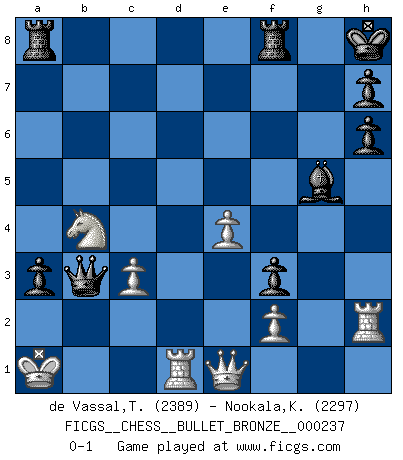 Last move : 0-1 2010 April 18 22:47:19 [Event "FICGS__CHESS__BULLET_BRONZE__000237"] [Site "FICGS"] [Date "2010.04.18"] [Round "1"] [White "de Vassal,Thibault"] [Black "Nookala,Kamesh"] [Result "0-1"] [WhiteElo "2389"] [BlackElo "2297"] 1.e4 c5 2.Nf3 d6 3.d4 cxd4 4.Nxd4 Nf6 5.Nc3 a6 6.Be2 e5 7.Nb3 Be7 8.Qd3 O-O 9.g4 Nc6 10.g5 Nd7 11.Be3 a5 12.O-O-O a4 13.Nd2 a3 14.b3 Nc5 15.Bxc5 dxc5 16.h4 Be6 17.Qe3 Nd4 18.Kb1 f6 19.Bc4 Bxc4 20.Nxc4 fxg5 21.Nd5 b5 22.Nxe5 Qd6 23.Nd3 Nf3 24.h5 c4 25.Ne1 Ne5 26.Rg1 Kh8 27.Rg2 g4 28.Qe2 Bg5 29.Ka1 Qh6 30.Rh2 Nf3 31.Nxf3 gxf3 32.Qe1 Qe6 33.c3 cxb3 34.axb3 b4 35.h6 gxh6 36.Nxb4 Qxb3 0-1 Sicilian : Najdorf, Opovcensky variation Kingside Castling by player Black (move 8) Queenside Castling by player White (move 12) Player Black won this chess game. Follow this game move after move (download)Fischer, who may or may not be mad as a hatter, has every right to be horrified. (Jeremy Silman) Ich war schon mal beim Dopingtest. Da musste ich Urin abgeben, während Dritte zusahen. (Elisabeth Pähtz) Bobby es la celebridad menos entendida y malinterpretada que camina el la faz de esta tierra. (Yasser Seirawan) Nous sommes les pions de la mystérieuse partie d'Echecs jouée par Dieu. Il nous déplace, nous arrête, nous pousse encore, puis nous lance un à un dans la boîte du Néant. Epitaphe sur la tombe de David Janowsky (1868-1927). Humor is by far the most significant activity of the human brain. (Edward De Bono)