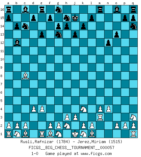 Last move : 1-0 2010 April 12 20:56:36 [Event "FICGS__BIG_CHESS__TOURNAMENT__000057"] [Site "FICGS"] [Date "2009.12.23"] [Round "1"] [White "Rusli,Rafnizar"] [Black "Jerez,Miriam"] [Result "1-0"] [WhiteElo "1784"] [BlackElo "1515"] 1.j2-k4 h15-g13 2.h1-o7 m15-m13 3.o7-c7 j15-k13 4.c7-c15 e15-e13 5.c15-c7 k15-k14 6.m2-m4 n15-n13 7.d2-d4 g15-g14 8.n2-n4 o15-o13 9.c7-j7 j14-j13 10.e2-e4 p16-q14 11.p1-q3 n13-n12 12.o1-g8 b15-b14 13.j7-k7 b16-c14 14.k7-k13 h16-h15 15.g8-m13 l16-k15 16.m13-k15 j16-j15 17.k13-h15 k16-h15 18.k15-c8 f16-b12 19.m1-m3 1-0 This big chess game has been lost on time (started : 2009.12.23 16:59:59) Follow this game move after move (download)My style is somewhere between that of Tal and Petrosian. (Reshevsky) Moralische Siege zählen nicht. (Savielly Grigorievitsch Tartakower) El hombre es un frívolo, una creatura engañosa y como un jugador de Ajedrez, se preocupa mas por el proceso de obtener su meta que de la meta por sí misma. (Dostoyevsky) Si je n'étais pas joueur d'échecs, je serais le meilleur dans quelque chose d'autre. (Anatoli Karpov) The message for business people contemplating their place in the cyberspace is simple and direct: get linked or get lost. (Vic Sussman and Kenan Pollack)
