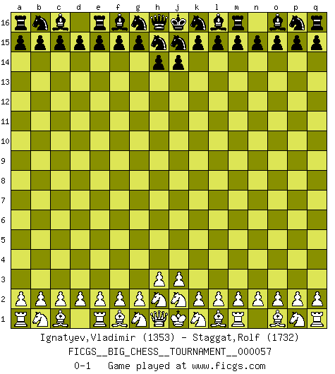 Last move : 0-1 2009 December 24 0:32:30 [Event "FICGS__BIG_CHESS__TOURNAMENT__000057"] [Site "FICGS"] [Date "2009.12.23"] [Round "1"] [White "Ignatyev,Vladimir"] [Black "Staggat,Rolf"] [Result "0-1"] [WhiteElo "1353"] [BlackElo "1732"] 0-1 Follow this game move after move (download)Fischer prefers to enter Chess history alone. (Miguel Najdorf) Wenn es im Universum noch irgendwo intelligente Lebewesen gibt, dann kennen sie Go. (Emanuel Lasker) El muchacho (en ese entonces un niño de 12 años llamado Anatoly Karpov) no tiene ni idea de lo que es el Ajedrez y no hay futuro en absoluto para el en esta profesión. (Mikhail Botvinnik) Aidez vos pièces, elles vous aideront. (Paul Morphy) Patience, use the Force, think ! (Obi-Wan Kenobi in Star Wars ep.2)