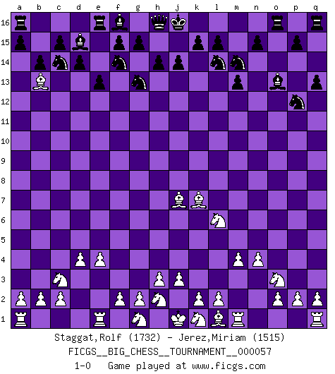 Last move : 1-0 2010 April 25 21:32:7 [Event "FICGS__BIG_CHESS__TOURNAMENT__000057"] [Site "FICGS"] [Date "2009.12.23"] [Round "1"] [White "Staggat,Rolf"] [Black "Jerez,Miriam"] [Result "1-0"] [WhiteElo "1732"] [BlackElo "1515"] 1.j2-k4 m15-m13 2.h1-o7 h15-g13 3.o7-o15 p16-o14 4.d2-d4 k16-l14 5.c1-o12 j15-k13 6.e2-e4 k13-m14 7.o15-o16 m16-o16 8.m2-m4 o14-p12 9.o12-j7 e15-e13 10.n2-n4 b15-b14 11.b1-c3 g16-f14 12.p1-o3 d15-d14 13.f1-e2 q15-q13 14.o1-j6 b16-c14 15.j6-b13 c16-d15 16.k4-l6 l16-o13 17.e2-k7 1-0 This big chess game has been lost on time (started : 2009.12.23 16:59:59) Follow this game move after move (download)On the chessboard, lies and hypocrisy do not survive long. (Emanuel Lasker) Du kannst im Schach nur gut werden, wenn du das Spiel liebst. (Robert James Fischer) El jugador blanco perdió porque fallo en recordar la coreccta continuación y tuvo que pensar por sí mismo las movidas. (Siegbert Tarrasch) Les échecs sont un jeu par leur forme, un art par leur essence et une science par sa difficulté d'acquisition. Ils peuvent vous procurer autant de plaisir qu'un bon livre ou une belle musique, mais vous n'aurez une réelle joie que si vous arrivez à bien jouer. (Tigran Petrosian) A married woman is like a fish riding a bicycle. (Rodolfo d'Ettorre)