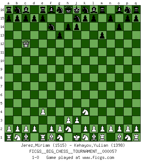 Last move : 1-0 2009 December 30 17:24:37 [Event "FICGS__BIG_CHESS__TOURNAMENT__000057"] [Site "FICGS"] [Date "2009.12.23"] [Round "1"] [White "Jerez,Miriam"] [Black "Kehayov,Yulian"] [Result "1-0"] [WhiteElo "1515"] [BlackElo "1398"] 1.j2-k4 g15-g13 2.e2-e4 m15-m13 3.h1-o7 o15-o14 4.o7-f15 h15-f14 5.f15-c12 1-0 Follow this game move after move (download)Only sissies Castle. (Rob Sillars) Im Fernschach kannst du während dem Spiel rauchen. (John Christen Knudsen) Es muy difícil jugar en contra de la teoría de Einstein. - en su primera derrota en contra de Fischer (Mikhail Tal) Mais l'homme est une créature légère et illogique : semblable au joueur d'échecs, il n'aime que le processus du but à atteindre, non le but lui-même. (Dostoïevsky) No enterprise is more likely to succeed than one concealed from the enemy until it is ripe for execution. (Niccolo Machiavelli)