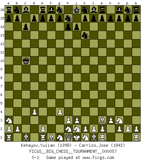 Last move : 0-1 2009 December 29 21:56:42 [Event "FICGS__BIG_CHESS__TOURNAMENT__000057"] [Site "FICGS"] [Date "2009.12.23"] [Round "1"] [White "Kehayov,Yulian"] [Black "Carrizo,Jose"] [Result "0-1"] [WhiteElo "1398"] [BlackElo "1842"] 1.g2-g4 j15-k13 2.d2-d4 h16-o10 3.p1-o3 o10-f2 4.e1-d1 f2-f10 5.n2-n3 f10-c10 6.o1-m3 c10-c2 7.d1-e1 c15-c14 8.b1-a3 c2-c10 0-1 Follow this game move after move (download)Robert Fischer is a law unto himself. (Larry Evans) Es liegt in der Natur, vernüftig zu denken und unlogisch zu handeln. (Anatole France) La mitad de las variaciones que son calculadas en una partida de torneo, resultan ser completamente superfluas. Desafortunadamente, nadie sabe por adelantado cual mitad. (Jan Tinman) Karpov est une pièce de musée. (Garry Kasparov) Convictions are more dangerous enemies of truth than lies. (Friedrich Nietzsche)