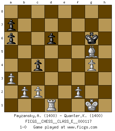 Last move : 1-0 2010 January 12 22:41:45 [Event "FICGS__CHESS__CLASS_E__000117"] [Site "FICGS"] [Date "2009.12.23"] [Round "1"] [White "Payzansky,Aleksey"] [Black "Quanter,Kirsty"] [Result "1-0"] [WhiteElo "1400"] [BlackElo "1400"] 1.e4 Nc6 2.Nf3 e6 3.d4 Nge7 4.d5 exd5 5.exd5 Nxd5 6.Qxd5 Nb4 7.Qd1 c5 8.a3 Na6 9.Bxa6 bxa6 10.Qd5 Rb8 11.O-O g6 12.Re1+ Be7 13.Qe5 f6 14.Qxb8 O-O 15.Nc3 Kg7 16.Nd5 Re8 17.Nxe7 Rxe7 18.Rxe7+ Qxe7 19.Qxc8 g5 20.Be3 d6 21.Qf5 h6 22.g4 c4 23.h4 Qf7 24.hxg5 hxg5 25.Nxg5 fxg5 26.Qxf7+ Kxf7 27.Bxg5 Kg6 28.Rd1 1-0 KP : Nimzovich defense Kingside Castling by player White (move 11) Kingside Castling by player Black (move 14) Player White won this chess game. Follow this game move after move (download)We must make sure that Chess will not be like a dead language, very interesting, but for a very small group. (Sytze Faber) Frage: Was machen Sie mit den Preisen? Anwort: Ich habe Angst, dass meine Freundin davon neue Kleider kauft. (Loek van Wely) Jugadores de primera clase pierden en contra de jugadores de segunda clase porque los jugadores de segunda clase a veces juegan una partida de primer clase. (Siegbert Tarrasch) Plusieurs personnes se sont demandées comment Tal faisait pour gagner... En fait, c'est très simple ! Il met ses pièces au centre de l'échiquier et les sacrifie quelque part ! (David Bronstein) If computers get too powerful, we can organize them into committees. That'll do them in. (Anonymous)