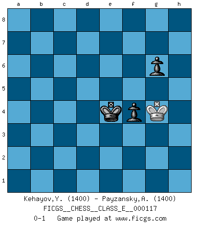 Last move : 0-1 2009 December 27 22:1:21 [Event "FICGS__CHESS__CLASS_E__000117"] [Site "FICGS"] [Date "2009.12.23"] [Round "1"] [White "Kehayov,Yulian"] [Black "Payzansky,Aleksey"] [Result "0-1"] [WhiteElo "1400"] [BlackElo "1400"] 1.e3 e5 2.d3 d5 3.Nf3 Nc6 4.Be2 Nf6 5.O-O Bd6 6.c3 e4 7.dxe4 dxe4 8.Nd4 Nxd4 9.exd4 O-O 10.Qc2 h6 11.Nd2 Re8 12.f3 exf3 13.Nxf3 c5 14.a3 Qc7 15.dxc5 Qxc5+ 16.Rf2 Ng4 17.Bd3 Nxf2 18.Qxf2 Qxf2+ 19.Kxf2 Bg4 20.h3 Bxf3 21.Kxf3 Re1 22.Rb1 Rae8 23.Bd2 Rxb1 24.Bxb1 b5 25.Bd3 Rb8 26.b4 Be5 27.Ke4 Rd8 28.Bxb5 Rxd2 29.Kxe5 Kf8 30.g4 Rh2 31.Bf1 Rf2 32.Bd3 Rf3 33.Kd4 Rxh3 34.Be2 Rh2 35.Ke3 Ke7 36.c4 Rh1 37.c5 Ra1 38.b5 Rxa3+ 39.Ke4 Ra2 40.Bf1 Ra4+ 41.Kf3 Ke6 42.c6 Kd6 43.Be2 a5 44.bxa6 Kxc6 45.Bd3 Kb6 46.Bf1 Rxa6 47.Bxa6 Kxa6 48.Ke4 Kb5 49.Kd5 g6 50.Ke5 Kc5 51.Ke4 Kd6 52.Kf4 Kd5 53.g5 hxg5+ 54.Kxg5 Ke5 55.Kg4 f5+ 56.Kh4 f4 57.Kg4 Ke4 0-1 Van't Kruijs Opening Kingside Castling by player White (move 5) Kingside Castling by player Black (move 9) 10 pieces endgame at move 44 : White KBPPP , Black KRPPP WHITE : King + 1 Bishop 3 Pawns BLACK : King + 1 Rook 3 Pawns 9 pieces endgame at move 44 : White KBPP , Black KRPPP WHITE : King + 1 Bishop 2 Pawns BLACK : King + 1 Rook 3 Pawns 8 pieces endgame at move 46 : White KBP , Black KRPPP WHITE : King + 1 Bishop 1 Pawn BLACK : King + 1 Rook 3 Pawns 7 pieces endgame at move 47 : White KBP , Black KPPP WHITE : King + 1 Bishop 1 Pawn BLACK : King + 3 Pawns 6 pieces endgame at move 47 : White KP , Black KPPP WHITE : King + 1 Pawn BLACK : King + 3 Pawns 5 pieces endgame at move 53 : White K , Black KPPP WHITE : King + BLACK : King + 3 Pawns 4 pieces endgame at move 54 : White K , Black KPP WHITE : King + BLACK : King + 2 Pawns Player Black won this chess game. Follow this game move after move (download)Whoever sees no other aim in the game than that of giving checkmate to one's opponent will never become a good Chess player. (Euwe) Schach ist ein Reich, wo sich die menschliche Phantasie frei entfalten kann. (David Bronstein) Yo no le temo a Spassky. Todos saben que yo soy el mejor. Uno no necesita un torneo para probarlo. (Bobby Fischer) Même si vous avez un bon coup à faire, regardez toujours s'il n'y en a pas un qui lui soit préférable. (Pedro Damiano) Question: Is 'This statement is paradoxical' a paradoxical statement ? Or is it a meta-paradox ? (Normajean Yates)