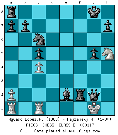 Last move : 0-1 2010 April 14 21:36:57 [Event "FICGS__CHESS__CLASS_E__000117"] [Site "FICGS"] [Date "2009.12.23"] [Round "1"] [White "Aguado Lopez,Antonio"] [Black "Payzansky,Aleksey"] [Result "0-1"] [WhiteElo "1389"] [BlackElo "1400"] 1.e4 c5 2.c4 Nc6 3.Nc3 g6 4.Nf3 Bg7 5.d3 d6 6.Be3 Nf6 7.Qc2 O-O 8.h3 Nd7 9.Nd5 e6 10.Nf4 Nde5 11.Nd2 f5 12.exf5 exf5 13.Be2 g5 14.Nh5 f4 15.Bxc5 dxc5 16.Qc3 Nf3+ 17.Nxf3 Bxc3+ 18.bxc3 Bf5 19.g4 fxg3 20.Nxg3 Qf6 21.Nh5 Qxc3+ 22.Kf1 Bxd3 23.Kg2 Bxe2 24.Kh2 Rxf3 25.Rhc1 Rxf2+ 26.Kg1 Qe3 27.Kh1 Qxh3+ 28.Kg1 Qg2+ 0-1 Sicilian defense Kingside Castling by player Black (move 7) Player Black won this chess game. Follow this game move after move (download)Chess is a beautiful mistress. (Bent Larsen) Man gibt nur Pakete auf. (Paul Keres) Botvinnik trataba de restarle el misterio al Ajedrez, siempre relacionandolo a situaciones de la vida ordinaria. El gustaba de llamar al Ajedrez un típico problema inexacto similar a aquellos de los cuales la gente siempre tiene que enfrentarse en la vida cotidiana. (Garry Kasparov) Les ravages du H expliquent la différence de niveau entre Tal et Thal [Abergel]. Art disturbs, science reassures. (Georges Braque, Le Jour et la Nuit)