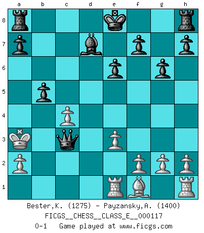 Last move : 0-1 2010 January 10 14:34:35 [Event "FICGS__CHESS__CLASS_E__000117"] [Site "FICGS"] [Date "2009.12.23"] [Round "1"] [White "Bester,Kazimierz"] [Black "Payzansky,Aleksey"] [Result "0-1"] [WhiteElo "1275"] [BlackElo "1400"] 1.c4 Nf6 2.Nf3 g6 3.d4 Bg7 4.Bg5 d5 5.Nc3 Ne4 6.Nxd5 Nxg5 7.Nxg5 e6 8.Qa4+ Bd7 9.Nxc7+ Qxc7 10.Qb4 Nc6 11.Qb3 Nxd4 12.Qd3 Qa5+ 13.Qc3 Nc2+ 14.Kd1 Bxc3 15.Kxc2 Bxb2 16.Kxb2 Qxg5 17.e3 b5 18.Re1 Qe5+ 19.Ka3 Qc3+ 0-1 English Opening Player Black won this chess game. Follow this game move after move (download)When you see a good move, look for a better one. (Emanuel Lasker) Mutter, ich bin eben Ex-Weltmeister geworden. --beim nach Hause Kommen nach dem Verlust des WM-Titels an Mihail Botvinnik -- (Mikhail Nekhemyevich Tal) Con el fin de mejorar tu juego, debes de estudiar los finales antes que todo, ya que mientras que los finales pueden ser estudiados y dominados por sí mismos, el juegomedio y la apertura deben de ser estudiados en relación con los finales. (José Raúl Capablanca) On est toujours la mazette de quelqu'un d'autre. (Anonyme) The worth of a book is to be measured by what you can carry away from it. (James Bryce)