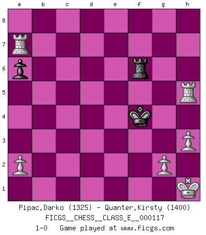 Last move : 1-0 2010 February 21 23:35:37 [Event "FICGS__CHESS__CLASS_E__000117"] [Site "FICGS"] [Date "2009.12.23"] [Round "1"] [White "Pipac,Darko"] [Black "Quanter,Kirsty"] [Result "1-0"] [WhiteElo "1325"] [BlackElo "1400"] 1.e4 Nc6 2.d4 d5 3.exd5 Qxd5 4.Nf3 f6 5.Nc3 Qd7 6.Bb5 a6 7.Bxc6 Qxc6 8.d5 Qb6 9.O-O Bg4 10.h3 Bh5 11.Be3 Qxb2 12.Rb1 Qxc3 13.Rxb7 Bxf3 14.Qxf3 Qxc2 15.d6 Rc8 16.dxe7 Bxe7 17.Re1 g5 18.Bd4 h5 19.Bxf6 Nxf6 20.Qxf6 Rh7 21.Qxg5 Rf7 22.Qg8+ Rf8 23.Qe6 Qxf2+ 24.Kh1 Qh4 25.Qxc8+ Kf7 26.Qe6+ Kg7 27.Qxe7+ Qxe7 28.Rxe7+ Kf6 29.Rexc7 Kg5 30.Ra7 Rf6 31.Rc5+ Kf4 32.Rxh5 1-0 KP : Nimzovich defense Kingside Castling by player White (move 9) 10 pieces endgame at move 29 : White KRRPPP , Black KRPP WHITE : King + 2 Rooks 3 Pawns BLACK : King + 1 Rook 2 Pawns 9 pieces endgame at move 32 : White KRRPPP , Black KRP WHITE : King + 2 Rooks 3 Pawns BLACK : King + 1 Rook 1 Pawn Player White won this chess game. Follow this game move after move (download)The passion for playing Chess is one of the most unaccountable in the world. (H.G. Wells) Ein Gewinn durch eine ungenaue Kombination, sei sie auch noch so vorzeigbar, erfüllt mich mit Schaudern. (Wilhelm Steinitz) No solamente yo pronostico su triunfo sobre Botvinnik, sino que me adelanto y digo que probablemente Fischer es el jugador de Ajedrez mas grande que haya existido. (John Collins) Celui qui prend des risques peut perdre, celui qui n'en prend pas perd toujours. (Xavier Tartacover) Beta. Software undergoes beta testing shortly before it's released. Beta is latin for still doesn't work. (Anonymous)