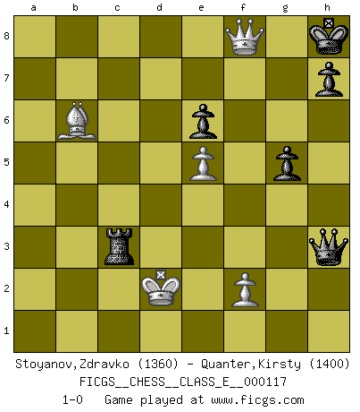 Last move : 1-0 2010 February 17 16:47:35 [Event "FICGS__CHESS__CLASS_E__000117"] [Site "FICGS"] [Date "2009.12.23"] [Round "1"] [White "Stoyanov,Zdravko"] [Black "Quanter,Kirsty"] [Result "1-0"] [WhiteElo "1360"] [BlackElo "1400"] 1.e4 Nc6 2.Nf3 e6 3.a3 b6 4.Bb5 Nge7 5.d4 a6 6.d5 axb5 7.dxc6 Nxc6 8.O-O Ba6 9.Re1 b4 10.axb4 Nxb4 11.c3 Nd3 12.Re3 Bc5 13.Rxd3 Bxd3 14.Qxd3 Rxa1 15.b4 Bd6 16.e5 Bf8 17.h3 f5 18.Nfd2 c5 19.bxc5 bxc5 20.c4 g6 21.Ba3 Qb6 22.Qc2 Bh6 23.Kh2 Bxd2 24.Bxc5 Qxb1 25.Qxd2 Qh1+ 26.Kg3 Rc1 27.Qg5 Rc3+ 28.Be3 Rxc4 29.Bb6 O-O 30.Qd2 f4+ 31.Kf3 g5 32.Qxd7 Rc3+ 33.Ke2 f3+ 34.gxf3 Qxf3+ 35.Kd2 Qxh3 36.Qd6 Kh8 37.Qxf8+ 1-0 KP : Nimzovich defense Kingside Castling by player White (move 8) Kingside Castling by player Black (move 29) Player White won this chess game. Follow this game move after move (download)Kasparov : J'adoube , Ivanchuk : S'il vous plaît ! (Garry Kasparov & Vassily Ivanchuk, Linares 1997) Ich würde die 30 stärksten Spieler der USA im Simultanspiel besiegen. (José Raúl Capablanca) Existen dos clases de sacrificios: los correctos y los mÃos. (Mikhail Tal) D'abord les bases : Jouez et étudiez, puis étudiez et jouez, ensuite jouez et étudiez, puis étudiez et jouez. Deuxièmement : Donnez toujours le meilleur de vous-même ! (Ken Smith) I have opinions of my own - strong opinions - but I don't always agree with them. (George Bush)
