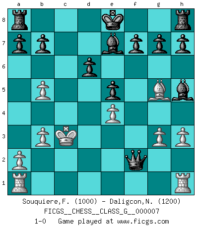 Last move : 1-0 2007 January 8 5:1:48 [Event "FICGS__CHESS__CLASS_G__000007"] [Site "FICGS"] [Date "2006.10.08"] [Round "1"] [White "Souquiere,Florence"] [Black "Daligcon,Nelson"] [Result "1-0"] [WhiteElo "1000"] [BlackElo "1200"] 1.e4 e5 2.d3 Nf6 3.Bg5 Nc6 4.c4 Be7 5.Nc3 Nd4 6.b3 d6 7.Nf3 Bg4 8.h3 Bxf3 9.Qd2 Bh5 10.Be2 Bxe2 11.Nb5 Bh5 12.Qe3 Nc2+ 13.Kd2 Nxe3 14.Kxe3 c6 15.g3 cxb5 16.cxb5 Qb6+ 17.Kd2 Qxf2+ 18.Kc3 Nxe4+ 19.dxe4 1-0 This chess game has been lost on time (started : 2006.10.08 6:33:49) Variation Indian Opening : Indian Opening Player White won this chess game. Follow this game move after move (download)Chess is above all, a fight ! (Emanuel Lasker) Stil? Ich habe keinen Stil! (Anatoly Karpov) Un buen sacrificio es aquel que aunque no sea necesariamente sólido, deja a tu oponente aturdido y confuso. (Rudolph Spielmann) Seul un grand joueur sait à quel point il joue faiblement. (Xavier Tartacover) All battles are fought by scared men who'd rather be someplace else. (John Wayne in the movie In harm's way)