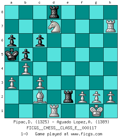 Last move : 1-0 2010 April 24 21:37:23 [Event "FICGS__CHESS__CLASS_E__000117"] [Site "FICGS"] [Date "2009.12.23"] [Round "1"] [White "Pipac,Darko"] [Black "Aguado Lopez,Antonio"] [Result "1-0"] [WhiteElo "1325"] [BlackElo "1389"] 1.e4 e5 2.Nf3 Nc6 3.Bb5 Nd4 4.Nxd4 exd4 5.c3 a6 6.Bc4 dxc3 7.dxc3 b5 8.Bb3 Nf6 9.Bg5 Bb7 10.O-O Bxe4 11.Re1 Be7 12.Bxf6 Bxf6 13.Rxe4+ Be7 14.Qf3 f6 15.Nd2 c6 16.Rae1 Qc7 17.Rxe7+ Kd8 18.Rxg7 Qd6 19.Ne4 Qe5 20.Qxf6+ Qxf6 21.Nxf6 Kc7 22.Rxd7+ Kb6 23.Rxh7 Rhd8 24.Nd7+ Kc7 25.Ne5 Kb6 26.Rd1 Re8 27.Nd7+ Ka5 28.a3 Rad8 29.Bc2 Re2 30.b4+ 1-0 Ruy Lopez : Bird's defense Kingside Castling by player White (move 10) Player White won this chess game. Follow this game move after move (download)Chess opens and enriches your mind. (Saudin Robovic) Ohne Fehler kann es keine Brillanz geben. (Emanuel Lasker) Bobby es el jugador de Ajedrez mas fino que este país jamás haya producido. Su memoria para las movidas, su brillantez en soñar combinaciones y su feróz determinación por la victoria son algo extraño. (John Collins) Il n'y a plus de joueurs du niveau de Jacob Murray dont la seule quête est le beau jeu, le plaisir de voir les pièces construire quelque chose. Sur 10 idées à la minute, 9 seront sans intérêt, la dernière s'avèrera géniale. (Christian Bauer) No man has ever achieved immortality in his own life time. (Unknown)