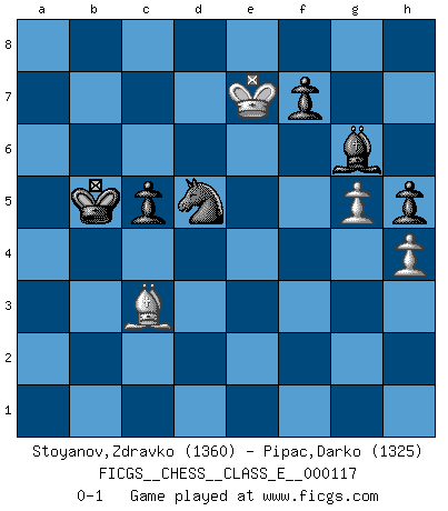 Last move : 0-1 2010 January 15 11:11:13 [Event "FICGS__CHESS__CLASS_E__000117"] [Site "FICGS"] [Date "2009.12.23"] [Round "1"] [White "Stoyanov,Zdravko"] [Black "Pipac,Darko"] [Result "0-1"] [WhiteElo "1360"] [BlackElo "1325"] 1.e4 e5 2.Nf3 Nc6 3.a3 a6 4.d3 d5 5.exd5 Qxd5 6.h3 h6 7.c4 Qd6 8.Be2 Nf6 9.O-O e4 10.dxe4 Nxe4 11.Bd3 Bf5 12.Qb3 O-O-O 13.Rd1 Nc5 14.Qc3 Nxd3 15.Be3 Qf6 16.Qxf6 gxf6 17.b4 Nde5 18.Rxd8+ Kxd8 19.Nd4 Nxd4 20.Bxd4 Bd6 21.c5 Be7 22.Nc3 Kc8 23.Nd5 Nc6 24.Nxe7+ Nxe7 25.Bxf6 Re8 26.Re1 Kd7 27.g4 Bg6 28.f4 Nd5 29.Rxe8 Kxe8 30.Bg7 Nxf4 31.Kh2 h5 32.g5 Kd7 33.Be5 Nd3 34.Bg3 Nb2 35.h4 Nd1 36.Be5 Ne3 37.Bb2 b6 38.Bd4 Nc2 39.Bf2 bxc5 40.Bxc5 Nxa3 41.Kg3 Nc4 42.Kf4 Kc6 43.Bd4 a5 44.bxa5 Nxa5 45.Ke5 Kb5 46.Kd5 c6+ 47.Kd6 Nc4+ 48.Ke7 c5 49.Bf6 Ne3 50.Bc3 Nd5+ 0-1 King's pawn game Kingside Castling by player White (move 9) Queenside Castling by player Black (move 12) 10 pieces endgame at move 44 : White KBPP , Black KBNPPP WHITE : King + 1 Bishop 2 Pawns BLACK : King + 1 Bishop 1 Knight 3 Pawns Player Black won this chess game. Follow this game move after move (download)Chess makes man wiser and clear-sighted. (Vladimir Putin) Ich glaube, ich kenne inzwischen die Gründe für mein Versagen: schachliche Charakterfehler. Ich war nie ein Wunderkind und in meiner gesamten menschlichen Entwicklung immer zu langsam. (Viktor Kortschnoi) Si el ingenio solamente fuese necesario para lucirse, las mujeres serían las mejores jugadoras de Ajedrez del mundo. (Albin) Un millionnaire : 'Monsieur Steinitz ! Vous ne participez aux tournois que pour l'argent, alors que moi je n'y viens que pour l'honneur.' Steinitz : 'Chacun joue pour ce qu'il n'a pas'... Wipe them out. All of them. (Darth Sidious in Star Wars ep.1)