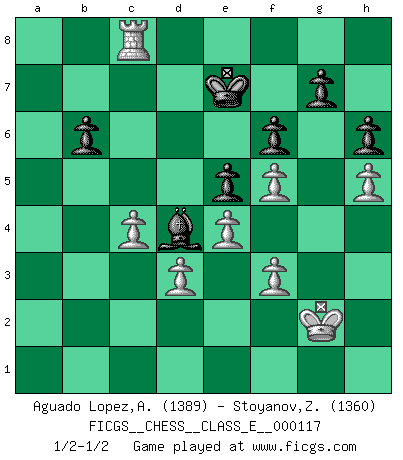 Last move : 1/2-1/2 2010 August 16 3:47:27 [Event "FICGS__CHESS__CLASS_E__000117"] [Site "FICGS"] [Date "2009.12.23"] [Round "1"] [White "Aguado Lopez,Antonio"] [Black "Stoyanov,Zdravko"] [Result "1/2-1/2"] [WhiteElo "1389"] [BlackElo "1360"] 1.e4 c5 2.c4 Nc6 3.Nc3 e5 4.Nf3 d6 5.d3 h6 6.a3 Bg4 7.Nd5 Be6 8.Nc3 Nf6 9.h3 Be7 10.Be2 O-O 11.O-O Re8 12.g4 Qc8 13.Qd2 Na5 14.Bd1 Qd8 15.Ba4 Bd7 16.b4 cxb4 17.axb4 Bxa4 18.Rxa4 Nb3 19.Qc2 Nxc1 20.Rxc1 Nd7 21.Nd5 a6 22.Qd2 Nb6 23.Nxb6 Qxb6 24.Rb1 a5 25.Rba1 Ra6 26.Rxa5 Rxa5 27.Rxa5 Qd8 28.Qe3 f6 29.Nh4 d5 30.Rxd5 Qa8 31.Qf3 Bxb4 32.Qf5 Bc3 33.Rd7 Qc8 34.Ng6 Bd2 35.Ne7+ Rxe7 36.Rxe7 Qxf5 37.gxf5 b6 38.Rb7 Ba5 39.Rb8+ Kf7 40.Ra8 Bb4 41.Ra7+ Kf8 42.Ra4 Bc5 43.Ra8+ Ke7 44.Rc8 Bd4 45.Rc7+ Kf8 46.Rd7 Kg8 47.Kg2 Bc5 48.h4 Kf8 49.Rc7 Bd4 50.Rc8+ Ke7 51.f3 Be3 52.h5 Bd4 1/2-1/2 Sicilian defense Kingside Castling by player Black (move 10) Kingside Castling by player White (move 11) This chess game ended in a draw. Follow this game move after move (download)It is not a move, even the best move that you must seek, but a realizable plan. (Eugene Znosko-Borovsky) Jeder Schachmeister war einmal ein Anfänger. (Irving Chernev) El poder defensivo de una pieza clavada, solamente es imaginario. (Aaron Nimzovich) La menace est plus forte que l'exécution. (Aaron Nimzovitch) When it is a question of money, everybody is of the same religion. (Voltaire)