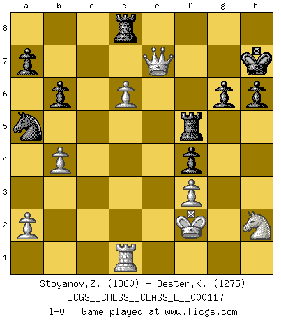Last move : 1-0 2010 February 8 10:45:9 [Event "FICGS__CHESS__CLASS_E__000117"] [Site "FICGS"] [Date "2009.12.23"] [Round "1"] [White "Stoyanov,Zdravko"] [Black "Bester,Kazimierz"] [Result "1-0"] [WhiteElo "1360"] [BlackElo "1275"] 1.e4 Nf6 2.d3 d6 3.Nf3 g6 4.h3 Bg7 5.Be2 O-O 6.O-O Nc6 7.c3 b6 8.Ng5 e5 9.d4 Re8 10.Bb5 Bd7 11.d5 Ne7 12.Ba6 c5 13.Be3 h6 14.Nf3 Nxe4 15.Bd3 f5 16.g4 f4 17.Bxf4 exf4 18.Bxe4 Kh7 19.Qd2 Be5 20.Nxe5 dxe5 21.d6 Nc6 22.Qc2 Qg5 23.Nd2 Rf8 24.f3 Rf6 25.Qd3 Qh4 26.Rf2 Qxh3 27.Nf1 Bxg4 28.Rh2 Qxh2+ 29.Nxh2 Bf5 30.Bxf5 Rxf5 31.Rd1 Rd8 32.Qd5 Na5 33.b4 cxb4 34.cxb4 e4 35.Qxe4 Rg5+ 36.Kf2 Rf5 37.Qe7+ 1-0 Alekhine's defense : Maroczy variation Kingside Castling by player Black (move 5) Kingside Castling by player White (move 6) Player White won this chess game. Follow this game move after move (download)Of all my Russian books, the defense contains and diffuses the greatest 'warmth' which may seem odd seeing how supremely abstract Chess is supposed to be. (Vladimir Nabokov) Schon mancher Spieler hat aufgegeben, um zu vermeiden, daß er eine Figur verliert. (Savielly Grigorievitsch Tartakower) Sin errores no puede haber brillantez. (Emanuel Lasker) Les Echecs mettent en conflit, non pas deux intelligences, mais deux volontés. (Lasker) Optimism is a variety of information deficit. Sometimes especially true for correspondence chess games. (Michael Aigner)