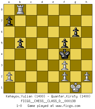 Last move : 1-0 2010 January 20 17:29:8 [Event "FICGS__CHESS__CLASS_D__000138"] [Site "FICGS"] [Date "2009.12.25"] [Round "1"] [White "Kehayov,Yulian"] [Black "Quanter,Kirsty"] [Result "1-0"] [WhiteElo "1400"] [BlackElo "1400"] 1.d4 d5 2.Nc3 Nf6 3.e3 g6 4.Bd3 e6 5.Nf3 c5 6.dxc5 Bxc5 7.O-O O-O 8.Na4 Bb6 9.Nxb6 Qxb6 10.c3 h6 11.e4 dxe4 12.Bxh6 Rd8 13.Be3 Qxb2 14.Qe2 Qxc3 15.Bc4 exf3 16.gxf3 Nd5 17.Bxd5 Rxd5 18.Rac1 Qe5 19.Rxc8+ Kg7 20.Re1 f5 21.Bh6+ Kxh6 22.Qxe5 Rxe5 23.Rxe5 Kg5 24.Rxe6 Kf4 25.R6e8 b5 26.Rxb8 Rxb8 27.Rxb8 1-0 Queen's pawn : Chigorin variation Kingside Castling by player White (move 7) Kingside Castling by player Black (move 7) Player White won this chess game. Follow this game move after move (download)Capture of the adverse King is the ultimate but not the first object of the game. (William Steinitz) Taktik ist was man tun muß, wenn etwas zu tun ist. Strategie ist was man tun muß, wenn nichts zu tun ist. (Savielly Grigorievitsch Tartakower) Del Ajedrez se ha dicho que la vida no es lo suficientemente larga para él, pero eso es culpa de la vida, no del Ajedrez. (William Ewart Napier) RxDa4 pat (...) A woman without a man is like a fish without a bicycle. (Gloria Steinem)