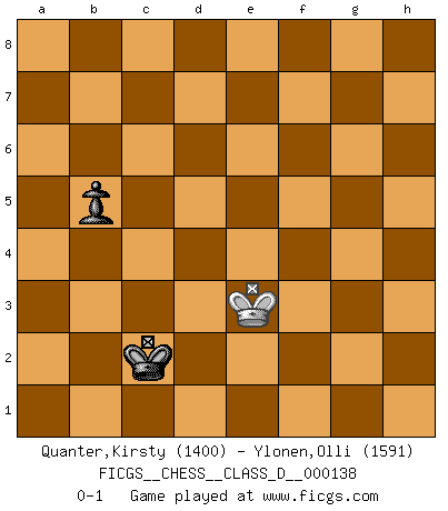 Last move : 0-1 2010 April 10 11:3:49 [Event "FICGS__CHESS__CLASS_D__000138"] [Site "FICGS"] [Date "2009.12.25"] [Round "1"] [White "Quanter,Kirsty"] [Black "Ylonen,Olli"] [Result "0-1"] [WhiteElo "1400"] [BlackElo "1591"] 1.e4 e5 2.Nc3 Nf6 3.Nf3 Nc6 4.d4 d6 5.dxe5 dxe5 6.Bb5 Qxd1+ 7.Nxd1 Nxe4 8.Nxe5 Bd7 9.f3 Nf6 10.Bxc6 Bxc6 11.Nxc6 bxc6 12.O-O Bc5+ 13.Be3 Bxe3+ 14.Nxe3 Nd5 15.Rfe1 O-O 16.a3 Nxe3 17.Rxe3 Rfe8 18.Rxe8+ Rxe8 19.Kf2 h5 20.h4 f6 21.g4 hxg4 22.fxg4 Re4 23.Kf3 Re5 24.Kf4 Re2 25.Rc1 g6 26.b4 Rf2+ 27.Kg3 Re2 28.Kf3 Re5 29.c4 f5 30.h5 fxg4+ 31.Kf4 Rxh5 32.Kxg4 Rf5 33.a4 Kg7 34.a5 Kh6 35.Rh1+ Rh5 36.Rxh5+ gxh5+ 37.Kh4 Kg6 38.b5 Kf5 39.Kxh5 cxb5 40.cxb5 Ke5 41.Kg5 Kd5 42.b6 cxb6 43.axb6 axb6 44.Kf4 Kc4 45.Ke3 Kc3 46.Ke2 Kc2 47.Ke3 b5 0-1 Vienna : Falkbeer variation Kingside Castling by player White (move 12) Kingside Castling by player Black (move 15) 10 pieces endgame at move 36 : White KRPPP , Black KPPPP WHITE : King + 1 Rook 3 Pawns BLACK : King + 4 Pawns 9 pieces endgame at move 36 : White KPPP , Black KPPPP WHITE : King + 3 Pawns BLACK : King + 4 Pawns 8 pieces endgame at move 39 : White KPPP , Black KPPP WHITE : King + 3 Pawns BLACK : King + 3 Pawns 7 pieces endgame at move 39 : White KPP , Black KPPP WHITE : King + 2 Pawns BLACK : King + 3 Pawns 6 pieces endgame at move 40 : White KPP , Black KPP WHITE : King + 2 Pawns BLACK : King + 2 Pawns 5 pieces endgame at move 42 : White KP , Black KPP WHITE : King + 1 Pawn BLACK : King + 2 Pawns 4 pieces endgame at move 43 : White KP , Black KP WHITE : King + 1 Pawn BLACK : King + 1 Pawn 3 pieces endgame at move 43 : White K , Black KP WHITE : King + BLACK : King + 1 Pawn Player Black won this chess game. Follow this game move after move (download)Chess mastery essentially consists of analyzing Chess positions accurately. (Mikhail Botvinnik) Meine Liebe ist Schach, Schach, Schach. Ich muss jeden Tag Schach spielen, deshalb fühle ich mich so stark. (Miguel Najdorf) No hay un Gran Maestro de Ajedrez que sea normal; solo se diferencían ellos por la magnitud de su locura. (Viktor Korchnoi) Les échecs sont utiles à l'exercice de la faculté de penser et à celle de l'imagination. Car nous devons posséder une méthode élaborée pour atteindre des buts partout où nous devons conduire notre raison. (Leibnitz) The large trees attract high winds. (Chinese proverb)