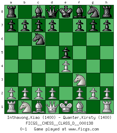 Last move : 0-1 2010 February 13 8:43:4 [Event "FICGS__CHESS__CLASS_D__000138"] [Site "FICGS"] [Date "2009.12.25"] [Round "1"] [White "Inthavong,Kiao"] [Black "Quanter,Kirsty"] [Result "0-1"] [WhiteElo "1400"] [BlackElo "1400"] 1.e4 e5 2.Nf3 Nc6 0-1 This chess game has been lost on time (started : 2009.12.25 11:55:49) King's pawn game Player Black won this chess game. Follow this game move after move (download)Chess is thirty to forty percent psychology. You don't have this when you play a computer. I can't confuse it. (Judith Polgar) Ich hatte Angst gegen einen russischen Großmeister zu verlieren, und er befürchtete gegen einen kleinen Jungen zu verlieren. (über ein Remis gegen Juri Awerbach). (Robert James Fischer) Puntos débiles o agujeros en la posición de tu oponente deben de ser ocupados por piezas, no Peones. (Siegbert Tarrasch) Les réformistes prétendent que les progrès de la théorie conduiront à la disparition des échecs, et qu'il faut, pour leur rendre vie, en remanier les règles. En réalité, qu'exprime cette affirmation? Le mépris de l'intuition, de l'imagination et de tous les autres éléments qui font des échecs un art. (Alexander Alekhine) The Internet is the world's largest library. It's just that all the books are on the floor. (John Allen Paulos)