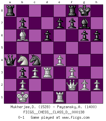 Last move : 0-1 2010 January 5 12:10:45 [Event "FICGS__CHESS__CLASS_D__000138"] [Site "FICGS"] [Date "2009.12.25"] [Round "1"] [White "Mukherjee,Deepankar"] [Black "Payzansky,Aleksey"] [Result "0-1"] [WhiteElo "1528"] [BlackElo "1400"] 1.e4 c5 2.Nf3 d6 3.d4 cxd4 4.Nxd4 Nf6 5.Nc3 g6 6.Be3 Bg7 7.Qd2 Ng4 8.Bg5 h6 9.Bh4 Nc6 10.Nb3 Be6 11.f3 Nge5 12.O-O-O Nc4 13.Bxc4 Bxc4 14.Bf2 Bxb3 15.axb3 Qa5 16.Na4 Qc7 17.Kb1 O-O 18.Nc3 a5 19.Nd5 Qd8 20.Bb6 Qd7 21.Rhe1 a4 22.Nc7 Rac8 23.Nd5 axb3 24.c3 Ne5 25.Qf2 Nc4 26.Rd3 Qa4 27.Nb4 Ra8 0-1 Sicilian : Dragon, 6.Be3 Queenside Castling by player White (move 12) Kingside Castling by player Black (move 17) Player Black won this chess game. Follow this game move after move (download)Examine moves that smite! A good eye for smites is far more important than a knowledge of strategical principles. (Purdy) Ja, ich habe einmal eine Blitzpartie gespielt, es war in einem Zug, 1929. --im Interview 1989 (Mikhail Moiseyevich Botvinik) Dejen al perfeccionista jugar por correo. (Yasser Seirawan) Les échecs, c'est l'imagination. (David Bronstein) All politicians must be presumed guilty until they are proven innocent. (Dinesh De Silva)
