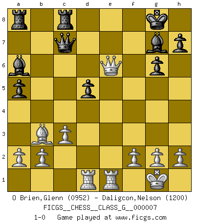Last move : 1-0 2007 February 5 2:53:27 [Event "FICGS__CHESS__CLASS_G__000007"] [Site "FICGS"] [Date "2006.10.08"] [Round "1"] [White "O Brien,Glenn"] [Black "Daligcon,Nelson"] [Result "1-0"] [WhiteElo "0952"] [BlackElo "1200"] 1.e4 c5 2.Nf3 Nc6 3.d4 cxd4 4.Nxd4 a6 5.Nc3 d6 6.Bc4 Nf6 7.O-O e6 8.Nxc6 bxc6 9.Re1 Be7 10.Bg5 O-O 11.Bxf6 Bxf6 12.Qh5 d5 13.Bb3 g6 14.Qf3 Bg7 15.Rad1 a5 16.Qe3 Qc7 17.exd5 cxd5 18.Na4 Bb7 19.c3 Ba6 20.Nc5 Rfc8 21.Nxe6 fxe6 22.Qxe6+ 1-0 Sicilian defense Kingside Castling by player White (move 7) Kingside Castling by player Black (move 10) Player White won this chess game. Follow this game move after move (download)First-class players lose to second class players because second-class players sometimes play a first-class game. (Tarrasch) Ivan Sokolov treibt mich als Beifahrer an mit go Loeky go - . (Loek van Wely) El muchacho (en ese entonces un niño de 12 años llamado Anatoly Karpov) no tiene ni idea de lo que es el Ajedrez y no hay futuro en absoluto para el en esta profesión. (Mikhail Botvinnik) Les Echecs sont et restent toujours un combat, un combat intégral comme la boxe, la lutte ou un autre sport, et où il doit y avoir un vainqueur et un vaincu. (Joseph Emil Diemer) To steal ideas from one person is plagiarism. To steal from many is research. (Unknown)