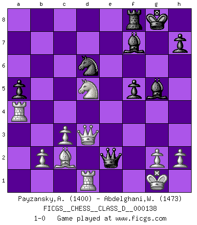 Last move : 1-0 2010 February 12 9:41:7 [Event "FICGS__CHESS__CLASS_D__000138"] [Site "FICGS"] [Date "2009.12.25"] [Round "1"] [White "Payzansky,Aleksey"] [Black "Abdelghani,Wael"] [Result "1-0"] [WhiteElo "1400"] [BlackElo "1473"] 1.e4 c5 2.Nf3 Nc6 3.d4 cxd4 4.Nxd4 Nf6 5.Nc3 e5 6.Ndb5 d6 7.Bg5 a6 8.Na3 b5 9.Nd5 Be7 10.Bxf6 Bxf6 11.c3 O-O 12.Nc2 Bg5 13.a4 bxa4 14.Rxa4 a5 15.Bb5 Bb7 16.O-O g6 17.Nce3 f5 18.exf5 gxf5 19.Qh5 Kh8 20.Rd1 Na7 21.Bd3 e4 22.Bc2 Bc6 23.Ra2 Be8 24.Qh3 Bg6 25.Nc4 Nb5 26.Ra4 Ra7 27.f4 exf3 28.Qxf3 Qe8 29.Qf2 Bf7 30.Nxd6 Nxd6 31.Qxa7 Qe2 32.Qd4+ Kg8 33.Qd3 1-0 Sicilian : Pelikan (Lasker/Sveshnikov) variation Kingside Castling by player Black (move 11) Kingside Castling by player White (move 16) Player White won this chess game. Follow this game move after move (download)By the beauty of his games, the clarity of his play, and the brilliance of his ideas, Fischer made himself an artist of the same stature as Brahms, Rembrandt, and Shakespeare. (David Levy) Das Blackmar-Diemer-Gambit verändert den ganzen Menschen! (Emil Joseph Diemer) Realmente no sabemos como el juego fue inventado, aunque hay sospechas. Tan pronto como descubramos a los culpables, se los haremos saber. (Bruce Pandolfini) Toute estimation doit être constamment réévaluée. (Jacob Estrin) If only people were all showed a certain minimum level of niceness; if only people didn't retract verbal draw offers (without draw box ticked) on ficgs; if only people didn't kill; if only people didn't run concentration / extermination camps, if only people didn't drop nuclear bombs on Hiroshima and Nagasaki, and so on - it would be a much more beautiful world. But sadly, things are not so... (Normajean Yates)