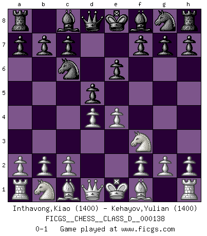Last move : 0-1 2010 February 4 8:20:2 [Event "FICGS__CHESS__CLASS_D__000138"] [Site "FICGS"] [Date "2009.12.25"] [Round "1"] [White "Inthavong,Kiao"] [Black "Kehayov,Yulian"] [Result "0-1"] [WhiteElo "1400"] [BlackElo "1400"] 1.e4 e6 2.Nf3 Nc6 3.d4 d5 0-1 This chess game has been lost on time (started : 2009.12.25 11:55:49) French defense Player Black won this chess game. Follow this game move after move (download)You can only get good at Chess if you love the game. (Bobby Fischer) Ich kenne Menschen, die allen Willen der Welt besitzen und doch nicht Schach spielen können. (Robert James Fischer) Mis oponentes también hacen buenas movidas. A veces yo no tomo esas cosas en consideración. (Bobby Fischer) Votre prénom est 'Tactique', votre deuxième prénom est 'Tactique' et votre nom est 'Tactique'. (Ken Smith) I find your interest interesting. (Gregory House, House M.D.)