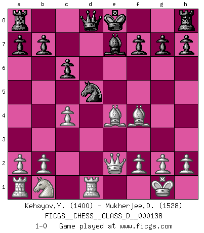 Last move : 1-0 2010 January 5 12:13:31 [Event "FICGS__CHESS__CLASS_D__000138"] [Site "FICGS"] [Date "2009.12.25"] [Round "1"] [White "Kehayov,Yulian"] [Black "Mukherjee,Deepankar"] [Result "1-0"] [WhiteElo "1400"] [BlackElo "1528"] 1.e4 e5 2.d4 exd4 3.Qxd4 Nc6 4.Qd1 Nf6 5.Bd3 d5 6.exd5 Nxd5 7.Nf3 Bg4 8.O-O Be7 9.Be4 Bxf3 10.Qxf3 Ne5 11.Qe2 Ng6 12.Rd1 c6 13.c4 Ngf4 14.Bxf4 1-0 Centre game Kingside Castling by player White (move 8) Player White won this chess game. Follow this game move after move (download)The stomach is an essential part of the Chess master. (Bent Larsen) Wenn Du absolut nicht mehr weißt, was Du tun sollst, dann ist es Zeit für Panik. (John van der Wiel) Debemos de asegurarnos de que el Ajedrez no se convierta en un lenguaje muerto, muy interesante, pero tan solo para un grupo muy pequeño. (Sytze Faber) Si le désir cupide (et stupide) de gagner est une inépuisable source de souffrance, une combinaison brillante sur l'échiquier est une découverte : le coquelicot qui s'épanouit lorsque apparaît la Voie Lactée. (Arrabal) Gambling : The sure way of getting nothing from something. (Wilson Mizner)