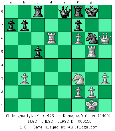Last move : 1-0 2010 January 2 17:48:48 [Event "FICGS__CHESS__CLASS_D__000138"] [Site "FICGS"] [Date "2009.12.25"] [Round "1"] [White "Abdelghani,Wael"] [Black "Kehayov,Yulian"] [Result "1-0"] [WhiteElo "1473"] [BlackElo "1400"] 1.d4 d5 2.c4 dxc4 3.Nf3 e6 4.Nc3 Nc6 5.e3 Nf6 6.Bxc4 Be7 7.O-O O-O 8.Qe2 Nb8 9.Rd1 Bd7 10.e4 c5 11.e5 Ne8 12.d5 exd5 13.Nxd5 Nc7 14.Nxe7+ Qxe7 15.Bg5 Qe8 16.a4 Nba6 17.Rd6 Bxa4 18.b3 Bb5 19.Rad1 Nb4 20.h3 Bxc4 21.Qxc4 Ne6 22.Qh4 h6 23.Bf6 Rc8 24.Qg4 h5 25.Qxh5 gxf6 26.exf6 Nd5 27.R1xd5 Nf4 28.Rg5+ Ng6 29.Qh6 1-0 QGA : 3.Nf3 Kingside Castling by player White (move 7) Kingside Castling by player Black (move 7) Player White won this chess game. Follow this game move after move (download)Robert Fischer is a law unto himself. (Larry Evans) Wenn Schach ein enormer Dschungel ist, der seine Myriaden von Geheimnissen nicht preisgeben will, dann sind Computer die Kettensägen einer gewaltigen ökologisch unsensiblen Nutzholzfirma. (Nigel Short) Antes de los Finales, los dioses han colocado el Juego Medio. (Siegbert Tarrasch) Karpov est une pièce de musée. (Garry Kasparov) I feel so... helpless. (C-3PO in Star Wars ep.3)