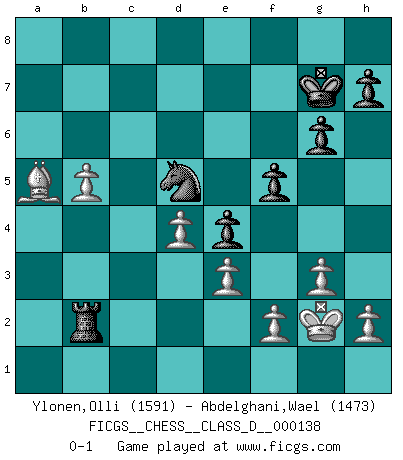 Last move : 0-1 2010 March 30 8:58:18 [Event "FICGS__CHESS__CLASS_D__000138"] [Site "FICGS"] [Date "2009.12.25"] [Round "1"] [White "Ylonen,Olli"] [Black "Abdelghani,Wael"] [Result "0-1"] [WhiteElo "1591"] [BlackElo "1473"] 1.g3 Nf6 2.Nf3 g6 3.Bg2 Bg7 4.O-O O-O 5.d4 d5 6.b3 c6 7.Bb2 Nbd7 8.Nbd2 Qc7 9.c4 Rd8 10.cxd5 cxd5 11.Rc1 Qa5 12.a4 b6 13.Bc3 Qa6 14.e3 b5 15.axb5 Qxb5 16.Re1 Rb8 17.Ra1 Ne4 18.Nxe4 dxe4 19.Nd2 f5 20.Rxa7 Nf6 21.Rxe7 Nd5 22.Rxg7+ Kxg7 23.Qa1 Qd3 24.Rc1 Qa6 25.Qxa6 Bxa6 26.Ba5 Rdc8 27.Rxc8 Rxc8 28.Bf1 Rc1 29.Kg2 Bxf1+ 30.Nxf1 Rb1 31.Nd2 Rb2 32.b4 Rxd2 33.b5 Rb2 0-1 Benko's Opening Kingside Castling by player White (move 4) Kingside Castling by player Black (move 4) Player Black won this chess game. Follow this game move after move (download)Chess holds its master in its own bonds, shackling the mind and brain so that the inner freedom of the very strongest must suffer. (Albert Einstein) Ein Isolani verdüstert die Stimmung auf dem ganzen Schachbrett. (Savielly Grigorievitsch Tartakower) Nada excita más a Grandes Maestros aburridos que una novedad teórica. (Dominic Lawson) Vous n'êtes pas toujours obligé de jouer le meilleur coup. Un coup doit être actif, entreprenant, correct et beau ! (David Bronstein) The right perception of any matter and a misunderstanding of the same matter do not wholly exclude each other. (Kafka's the trial)