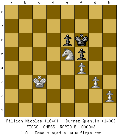 Last move : 1-0 2006 October 31 20:8:56 [Event "FICGS__CHESS__RAPID_B__000003"] [Site "FICGS"] [Date "2006.04.23"] [Round "1"] [White "Fillion,Nicolas"] [Black "Durnez,Quentin"] [Result "1-0"] [WhiteElo "1640"] [BlackElo "1400"] 1.e4 e5 2.Nf3 Nc6 3.Bb5 Bc5 4.c3 a6 5.Bxc6 dxc6 6.Nxe5 Nf6 7.d4 Ba7 8.O-O O-O 9.Qf3 Qe7 10.Bg5 Re8 11.Nd2 c5 12.Nd3 cxd4 13.e5 dxc3 14.exf6 Qd6 15.bxc3 h6 16.Nc4 Qd8 17.Bxh6 Qxf6 18.Qxf6 gxf6 19.Rfe1 Be6 20.Ne3 Rad8 21.Nf4 Kh7 22.Nxe6 Rxe6 23.Bf4 Rd3 24.Rac1 c6 25.Red1 Rxd1+ 26.Rxd1 Re7 27.g3 b5 28.Rd6 Re6 29.Rxe6 fxe6 30.Nc2 a5 31.Be3 Bxe3 32.Nxe3 f5 33.Kg2 c5 34.Kf3 b4 35.cxb4 cxb4 36.Ke2 a4 37.Kd3 Kg6 38.f4 b3 39.axb3 axb3 40.Kc3 b2 41.Kxb2 Kf6 42.Nc4 Kg6 43.Ne5+ Kf6 44.Kc3 1-0 This chess game has been lost on time (started : 2006.04.23 16:33:7) Ruy Lopez : Classical defense, 4.c3 Kingside Castling by player White (move 8) Kingside Castling by player Black (move 8) 10 pieces endgame at move 39 : White KNPPPP , Black KPPP WHITE : King + 1 Knight 4 Pawns BLACK : King + 3 Pawns 9 pieces endgame at move 39 : White KNPPP , Black KPPP WHITE : King + 1 Knight 3 Pawns BLACK : King + 3 Pawns 8 pieces endgame at move 41 : White KNPPP , Black KPP WHITE : King + 1 Knight 3 Pawns BLACK : King + 2 Pawns Player White won this chess game. Follow this game move after move (download)A Chess game is divided into three stages: the first, when you hope you have the advantage, the second when you believe you have an advantage, and the third... when you know you're going to lose ! (Savielly Tartakower) Mit Schach schule ich mein Gefühl für Geometrie, was für Tennis und Schach gleichermaßen wichtig ist. (Boris Becker) Cuando tu no sabes absolutamente que mas hacer, es tiempo de entrar en pánico. (John van der Wiel) J'apprécie les joueurs d'est-indienne, c'est grâce à eux que je nourris ma famille depuis tant d'années. (Petrosian) It is not titles that honor men, but men that honor titles. (Niccolo Machiavelli)