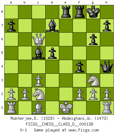 Last move : 0-1 2010 January 16 19:53:6 [Event "FICGS__CHESS__CLASS_D__000138"] [Site "FICGS"] [Date "2009.12.25"] [Round "1"] [White "Mukherjee,Deepankar"] [Black "Abdelghani,Wael"] [Result "0-1"] [WhiteElo "1528"] [BlackElo "1473"] 1.e4 c5 2.Nf3 Nc6 3.d4 cxd4 4.Nxd4 Nf6 5.Nc3 e5 6.Nf5 Nxe4 7.Nxe4 d5 8.Neg3 g6 9.Ne3 Be6 10.c3 f5 11.Nc2 Bc5 12.Bb5 Qh4 13.Qe2 O-O 14.Bxc6 bxc6 15.Qxe5 Rae8 16.Qc7 f4 17.Qxc6 Bd7 0-1 Sicilian : Pelikan (Lasker/Sveshnikov) variation Kingside Castling by player Black (move 13) Player Black won this chess game. Follow this game move after move (download)Avoid the crowd. Do your own thinking independently. Be the Chess player, not the Chess piece. (Ralph Charell) Eine Person mit durchschnittlichem IQ kann etwa eine ELO von 2000 erreichen. (Jonathan Levitt) La táctica fluye a partir de una posición superior. (Bobby Fischer) Demandez au pauvre Cg1 ce qu'il en pense. Eduard Gufeld à propos de la variante Saemisch de l'Est-Indienne. Live, lose, and learn, by observing your opponent how to win. (Amber Steenbock)