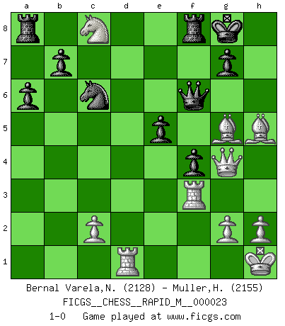 Last move : 1-0 2010 February 9 11:0:52 [Event "FICGS__CHESS__RAPID_M__000023"] [Site "FICGS"] [Date "2009.12.25"] [Round "1"] [White "Bernal Varela,Nelson"] [Black "Muller,Henri"] [Result "1-0"] [WhiteElo "2128"] [BlackElo "2155"] 1.e4 c5 2.Nf3 d6 3.d4 cxd4 4.Nxd4 Nf6 5.Nc3 a6 6.Bg5 e6 7.f4 Qb6 8.Qd2 Qxb2 9.Rb1 Qa3 10.e5 dxe5 11.fxe5 Nfd7 12.Ne4 h6 13.Bh4 Qxa2 14.Rd1 Qd5 15.Qe3 Qxe5 16.Be2 Bc5 17.Bg3 Bxd4 18.Rxd4 Qa5+ 19.Rd2 O-O 20.Bd6 Re8 21.O-O Nc6 22.Qg3 Qb6+ 23.Kh1 f5 24.Bh5 Rd8 25.Bf4 Qb5 26.R2d1 Rf8 27.Nd6 Qb2 28.Bxh6 Qf6 29.Bg5 Qe5 30.Bf4 Qc5 31.Rf3 Nde5 32.Bh6 Ng4 33.Bxg4 Qe5 34.Bh5 f4 35.Qg4 Qf6 36.Bg5 e5 37.Nxc8 1-0 Sicilian : Najdorf, 7...Qb6 Kingside Castling by player Black (move 19) Kingside Castling by player White (move 21) Player White won this chess game. Follow this game move after move (download)A bad day of Chess is better than any good day at work. (Anonymous) Ein Buch ist ein Spiegel; wenn ein Affe hineinsieht, so kann kein Apostel heraus gucken. (Georg Christoph Lichtenberg) Un jugador que es sorprendido, esta derrotado a medias. (Proverbio) La guerre est enfant de la passion, la passion est enfant du narcissisme et le narcissisme est l'enfant. (...) Une autre partie ? (Thibault de Vassal) A good player is always lucky. (Capablanca)