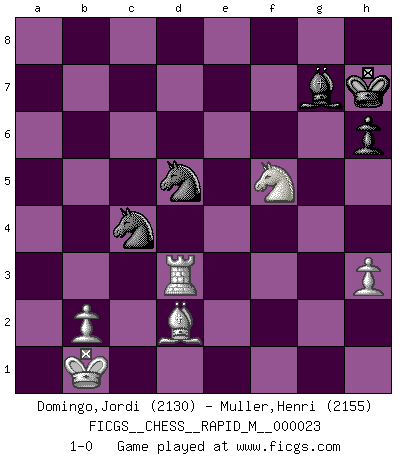 Last move : 1-0 2010 March 8 19:40:42 [Event "FICGS__CHESS__RAPID_M__000023"] [Site "FICGS"] [Date "2009.12.25"] [Round "1"] [White "Domingo,Jordi"] [Black "Muller,Henri"] [Result "1-0"] [WhiteElo "2130"] [BlackElo "2155"] 1.e4 c5 2.Nf3 d6 3.d4 cxd4 4.Nxd4 Nf6 5.Nc3 a6 6.Be3 e5 7.Nb3 Be6 8.f3 Be7 9.Qd2 O-O 10.O-O-O Nbd7 11.g4 b5 12.g5 b4 13.Ne2 Ne8 14.f4 a5 15.f5 a4 16.Nbd4 exd4 17.Nxd4 b3 18.Kb1 bxc2+ 19.Nxc2 Bb3 20.axb3 axb3 21.Na3 Ne5 22.Qg2 Qc7 23.f6 Bd8 24.Rd5 gxf6 25.gxf6 Kh8 26.Rg1 Ng6 27.Rb5 Rb8 28.Bh6 Rg8 29.Rxb8 Qxb8 30.Bc4 Bxf6 31.Bxf7 Qb7 32.Bxg8 Kxg8 33.Qe2 Be5 34.Qc4+ Kh8 35.h3 Nf6 36.Re1 Ng8 37.Bd2 Nf6 38.Bg5 Nd7 39.Qf7 Bg7 40.Re3 Qc6 41.Qd5 Qxd5 42.exd5 h6 43.Re8+ Kh7 44.Rd8 Nc5 45.Bc1 Ne4 46.Nc4 Ne7 47.Nxd6 Nf6 48.Rb8 Nfxd5 49.Rxb3 Kg6 50.Rg3+ Kh7 51.Rd3 Nb4 52.Rf3 Nbd5 53.Bd2 Nc6 54.Nf5 Ne5 55.Rb3 Nc4 56.Rd3 1-0 Sicilian : Najdorf, Byrne (English) attack Kingside Castling by player Black (move 9) Queenside Castling by player White (move 10) Player White won this chess game. Follow this game move after move (download)The blunders are all there on the board, waiting to be made. (Savielly Tartakover) Ein Teil des Fehlers ist immer korrekt. (Savielly Grigorievitsch Tartakower) Si el Ajedrez es una ciencia, es la mas inexacta. Si el Ajedrez es un arte, es demasiado inexacto para ser visto como tal. Si el Ajedrez es un deporte, es demasiado esotérico. Si el Ajedrez es un juego, es demasiado exigente para ser solo un juego. Si el Ajedrez es una aventura, es una muy demandante. Si el Ajedrez es una pasión, es una muy gratificante. Si el Ajedrez es la vida, es una muy triste. (Anónimo) Les Echecs représentent une sphère d'idées créatrices basée sur la volonté des deux protagonistes. (Smyslov) Never was anything great achieved without danger. (Niccolo Machiavelli)