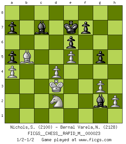 Last move : 1/2-1/2 2010 January 12 3:20:47 [Event "FICGS__CHESS__RAPID_M__000023"] [Site "FICGS"] [Date "2009.12.25"] [Round "1"] [White "Nichols,Scott"] [Black "Bernal Varela,Nelson"] [Result "1/2-1/2"] [WhiteElo "2100"] [BlackElo "2128"] 1.c4 Nf6 2.Nc3 g6 3.d4 d5 4.cxd5 Nxd5 5.e4 Nxc3 6.bxc3 Bg7 7.Bc4 c5 8.Ne2 O-O 9.O-O Nc6 10.Be3 Na5 11.Bd3 b6 12.Rb1 cxd4 13.cxd4 Bb7 14.Qa4 e6 15.Rfc1 Qe8 16.Qxe8 Rfxe8 17.f3 Rac8 18.Bb5 Rxc1+ 19.Rxc1 Rc8 20.Rxc8+ Bxc8 21.Bd2 Bb7 22.Bxa5 bxa5 23.Kf2 Kf8 24.Ke3 Bh6+ 25.Kd3 Bg5 26.Nc3 Bc1 27.g3 Ke7 28.Nd1 Ba3 29.Ne3 Bd6 30.e5 Bc7 31.f4 Bf3 32.a3 h6 33.Nc4 g5 34.fxg5 hxg5 35.Nd2 Bg2 36.a4 1/2-1/2 English Opening Kingside Castling by player Black (move 8) Kingside Castling by player White (move 9) This chess game ended in a draw. Follow this game move after move (download)I play correspondence chess because it is both art and science while chess is art only. (A player at FICGS) Ich verstehe mehr vom Schach als irgendein anderer lebender Meister. (José Raúl Capablanca) Aún deseo matar a Fischer. (Boris Spassky) Dans le domaine de la peinture, de la gravure et de la sculpture, dès la première décennie de notre siècle, les artistes abandonnent la représentation de la partie d'échecs pour se concentrer sur les pièces, sur les échiquiers et sur toutes les variations auxquelles les unes et les autres peuvent donner lieu. On passe en quelque sorte d'un thème social à un thème musical (au sens de la musica médiévale, c'est-à-dire d'une notion qui inclue le rythme, l'harmonie, la construction et la déconstruction, etc.). Graphiquement et picturalement, l'échiquier apparaît comme une structure ouverte, dynamique, d'une richesse infinie, autorisant toutes les combinatoires et débouchant sur des mouvements et des rythmes de nature exponentielle. (Michel Pastoureau) Those parts of the system that you can hit with a hammer (not advised) are called hardware; those program instructions that you can only curse at are called software. (Anonymous)