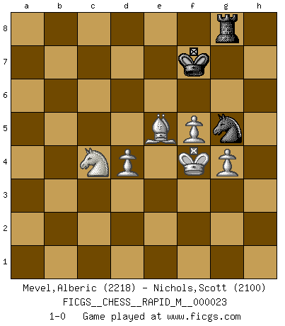 Last move : 1-0 2010 April 14 1:15:57 [Event "FICGS__CHESS__RAPID_M__000023"] [Site "FICGS"] [Date "2009.12.25"] [Round "1"] [White "Mevel,Alberic"] [Black "Nichols,Scott"] [Result "1-0"] [WhiteElo "2218"] [BlackElo "2100"] 1.e4 g6 2.d4 Bg7 3.Nc3 c5 4.dxc5 Bxc3+ 5.bxc3 Nf6 6.f3 Nc6 7.Be3 Qa5 8.Qd2 b6 9.cxb6 axb6 10.Bh6 Rg8 11.Bg5 Ne5 12.a4 Kf8 13.Bh6+ Ke8 14.Bg5 Kf8 15.h4 d6 16.Ne2 Nh5 17.Nd4 Bd7 18.Kf2 f6 19.Bh6+ Kf7 20.Bb5 Qa7 21.Ne2 Qc7 22.Rhb1 Bxb5 23.Qd5+ e6 24.Qxb5 Rgb8 25.Nd4 Qxc3 26.Qb4 Qxb4 27.Rxb4 f5 28.exf5 gxf5 29.Re1 Rd8 30.Bg5 Rd7 31.Kg1 h6 32.Bxh6 Nf6 33.Bg5 Nd5 34.Rb5 Nc7 35.Rxb6 Rxa4 36.Rd1 Nd5 37.Rb3 f4 38.Ne2 Nc6 39.h5 Kg7 40.Rbd3 Rf7 41.Rxd5 exd5 42.Rxd5 Ne5 43.Rxd6 Rf5 44.Bh6+ Kf7 45.Kf2 Rxh5 46.Bxf4 Rf5 47.g3 Rc4 48.c3 Ng6 49.Rd4 Rxd4 50.cxd4 Ra5 51.Bd6 Ra1 52.Ke3 Ke6 53.Bc5 Re1 54.Bb4 Rb1 55.Bd2 Ne7 56.Ke4 Rb2 57.Nf4+ Kf7 58.Ba5 Ng8 59.Bd8 Rb8 60.Bh4 Re8+ 61.Kd3 Rf8 62.Nd5 Kg6 63.Ke2 Re8+ 64.Ne3 Nh6 65.g4 Nf7 66.f4 Nd6 67.f5+ Kf7 68.Bg3 Ne4 69.Be5 Rc8 70.Nc4 Rg8 71.Kf3 Ng5+ 72.Kf4 1-0 Robatsch defense 10 pieces endgame at move 49 : White KBNPPP , Black KRRN WHITE : King + 1 Bishop 1 Knight 3 Pawns BLACK : King + 2 Rooks 1 Knight 9 pieces endgame at move 50 : White KBNPPP , Black KRN WHITE : King + 1 Bishop 1 Knight 3 Pawns BLACK : King + 1 Rook 1 Knight Player White won this chess game. Follow this game move after move (download)All I want to do, ever, is just play Chess. (Bobby Fischer) Fischer ist das größte Genie, das je vom Schachhimmel heruntergestiegen ist. (Mikhail Nekhemyevich Tal) Alguna parte de un error es siempre correcto. (Savielly Tartakover) Je crois qu'il existe des manières très spécifiques de jouer efficacement contre une machine. Evidemment, nous n'avons aucune chance en technique pure, parce que l'ordinateur calcule de manière parfaite. Mais lorsque nous faisons appel à notre cerveau, en utilisant l'intuition et la compréhension, alors nous restons beaucoup plus forts. (Anatoli Karpov) The production of too many useful things results in too many useless people. (Karl Marx)