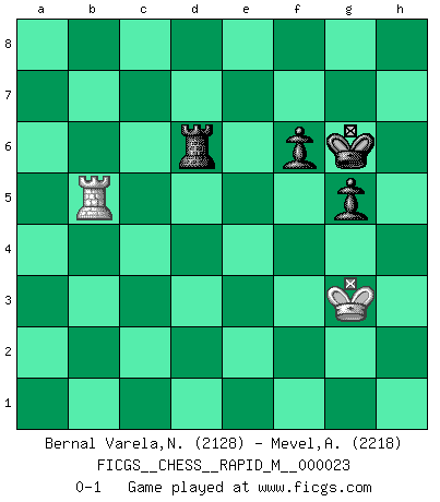 Last move : 0-1 2010 June 19 17:11:29 [Event "FICGS__CHESS__RAPID_M__000023"] [Site "FICGS"] [Date "2009.12.25"] [Round "1"] [White "Bernal Varela,Nelson"] [Black "Mevel,Alberic"] [Result "0-1"] [WhiteElo "2128"] [BlackElo "2218"] 1.e4 e5 2.Nf3 Nc6 3.Bb5 a6 4.Ba4 Nf6 5.O-O Be7 6.Re1 b5 7.Bb3 O-O 8.c3 d5 9.exd5 Nxd5 10.Nxe5 Nxe5 11.Rxe5 c6 12.d4 Bd6 13.Re1 Qh4 14.g3 Qh3 15.Bxd5 cxd5 16.Qf3 Bf5 17.Qxd5 Rae8 18.Bd2 Bf4 19.Rxe8 Rxe8 20.Qc6 Bd7 21.Qf3 Bg5 22.c4 Bf5 23.Qc6 Bd7 24.Qf3 h6 25.Be3 Bg4 26.Qg2 Qxg2+ 27.Kxg2 Bxe3 28.fxe3 Rxe3 29.Nc3 bxc4 30.d5 Rd3 31.Rf1 g5 32.Rf6 Kg7 33.Rf2 Kg6 34.Rc2 Bf3+ 35.Kf2 Kf5 36.d6 Ke6 37.Nb1 Bd5 38.Nd2 Kxd6 39.Nxc4+ Bxc4 40.Rxc4 Rd2+ 41.Kf3 Rxb2 42.Ra4 Rxh2 43.Rxa6+ Ke5 44.Ra5+ Kf6 45.Ra6+ Kg7 46.g4 f6 47.a4 Rh3+ 48.Kg2 Rh4 49.Kg3 h5 50.gxh5 Rxh5 51.a5 Rh1 52.Rb6 Ra1 53.a6 Kg6 54.Kf3 Ra4 55.Kg3 Kf5 56.Rb5+ Ke4 57.Kg4 Rxa6 58.Rf5 Rc6 59.Ra5 Rc1 60.Ra4+ Ke5 61.Ra5+ Ke6 62.Ra6+ Kf7 63.Ra7+ Kg6 64.Ra6 Rc4+ 65.Kg3 Rd4 66.Rb6 Kf5 67.Rb3 Rd6 68.Rb5+ Kg6 0-1 Ruy Lopez : Closed, 7...O-O Kingside Castling by player White (move 5) Kingside Castling by player Black (move 7) 10 pieces endgame at move 42 : White KRPP , Black KRPPPP WHITE : King + 1 Rook 2 Pawns BLACK : King + 1 Rook 4 Pawns 9 pieces endgame at move 43 : White KRPP , Black KRPPP WHITE : King + 1 Rook 2 Pawns BLACK : King + 1 Rook 3 Pawns 8 pieces endgame at move 50 : White KRPP , Black KRPP WHITE : King + 1 Rook 2 Pawns BLACK : King + 1 Rook 2 Pawns 7 pieces endgame at move 50 : White KRP , Black KRPP WHITE : King + 1 Rook 1 Pawn BLACK : King + 1 Rook 2 Pawns 6 pieces endgame at move 57 : White KR , Black KRPP WHITE : King + 1 Rook BLACK : King + 1 Rook 2 Pawns Player Black won this chess game. Follow this game move after move (download)Chess makes man wiser and clear-sighted. (Vladimir Putin) Ich glaube, ich kenne inzwischen die Gründe für mein Versagen: schachliche Charakterfehler. Ich war nie ein Wunderkind und in meiner gesamten menschlichen Entwicklung immer zu langsam. (Viktor Kortschnoi) Fischer sacrificó virtualmente todo lo que la mayoría de nosotros los 'debiles' (término que él usa) valoramos, respetamos y apreciamos por el amor de un astuto, a menudo hermoso tablero de juego, por el privilegio ambivalente de ser su mas grande maestro. (Paul Kollar) Karpov est une pièce de musée. (Garry Kasparov) I find television to be very educating. Every time somebody turns on the set, I go in the other room and read a book. (Groucho Marx)