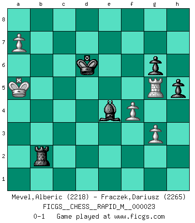 Last move : 0-1 2010 July 19 23:17:5 [Event "FICGS__CHESS__RAPID_M__000023"] [Site "FICGS"] [Date "2009.12.25"] [Round "1"] [White "Mevel,Alberic"] [Black "Fraczek,Dariusz"] [Result "0-1"] [WhiteElo "2218"] [BlackElo "2265"] 1.e4 e6 2.d4 d5 3.Nc3 Nf6 4.e5 Nfd7 5.f4 c5 6.Nf3 Nc6 7.Be3 Qb6 8.Qd2 Qxb2 9.Rb1 Qa3 10.Bb5 a6 11.Bxc6 bxc6 12.O-O Be7 13.Rb3 Qa5 14.Nxd5 Qxd2 15.Nc7+ Kf8 16.Bxd2 Ra7 17.Ba5 g6 18.c4 Kg7 19.d5 cxd5 20.cxd5 c4 21.Rc3 Rxc7 22.Bxc7 exd5 23.Rd1 Bb7 24.Rb1 Bc5+ 25.Kf1 Bc6 26.Bd6 Rd8 27.Bxc5 Nxc5 28.Ke1 Bd7 29.Nd4 Ne6 30.Nxe6+ Bxe6 31.Ra3 Rc8 32.Rxa6 d4 33.Rd6 d3 34.Kf2 Ra8 35.Ra1 Rb8 36.a4 Rb2+ 37.Ke3 Bf5 38.a5 Re2+ 39.Kd4 d2 40.Kxc4 Re1 41.Ra3 d1Q 42.Rxd1 Rxd1 43.a6 Be4 44.g3 f6 45.exf6+ Kxf6 46.a7 Ba8 47.Kb5 Rd2 48.h3 Ke6 49.Rc3 Rb2+ 50.Ka6 Kf5 51.Rc7 h5 52.Rc5+ Kf6 53.Rc3 Bh1 54.Rd3 Bg2 55.Ra3 Ke6 56.Rc3 Bf1+ 57.Ka5 Bxh3 58.Rc6+ Kf7 59.Rc7+ Kf6 60.Rc6+ Kg7 61.Rc7+ Kh6 62.Rb7 Ra2+ 63.Kb6 Bg2 64.Rd7 Ra1 65.Rd2 Bh1 66.Rd7 Rg1 67.Rd3 Rb1+ 68.Kc5 Ra1 69.Kb6 Kg7 70.Rc3 Kf7 71.Rb3 Ke6 72.Re3+ Kd6 73.Re5 Ra2 74.Rg5 Rb2+ 75.Ka5 Be4 0-1 French : Steinitz, Boleslavsky variation Kingside Castling by player White (move 12) Promotion Queen by player Black (move 41) 10 pieces endgame at move 57 : White KRPPP , Black KRBPP WHITE : King + 1 Rook 3 Pawns BLACK : King + 1 Rook 1 Bishop 2 Pawns Player Black won this chess game. Follow this game move after move (download)Adequate compensation for a sacrifice is having a sound combination leading to a winning position; adequate compensation for a blunder is having your opponent snatch defeat from the jaws of victory. (Bruce A. Moon) Schach ist gnadenlos. Du mußt bereit sein zu töten. (Nigel Short) Un jugador que es sorprendido, esta derrotado a medias. (Proverbio) Tout change constamment, y compris dans le monde des Echecs. (Botvinnik) Now the reason the enlightened prince and the wise general conquer the enemy whenever they move and their achievements surpass those of ordinary men is foreknowledge. (Sun Tzu)