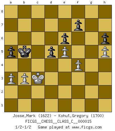 Last move : 1/2-1/2 2007 June 15 20:0:32 [Event "FICGS__CHESS__CLASS_C__000015"] [Site "FICGS"] [Date "2006.10.12"] [Round "1"] [White "Josse,Mark"] [Black "Kohut,Gregory"] [Result "1/2-1/2"] [WhiteElo "1622"] [BlackElo "1700"] 1.e4 e6 2.d4 d5 3.Nd2 c5 4.Ngf3 cxd4 5.Nxd4 Nf6 6.e5 Nfd7 7.N2f3 Nc6 8.Nxc6 bxc6 9.Bd3 Ba6 10.O-O Bxd3 11.Qxd3 Be7 12.Re1 O-O 13.c4 a5 14.Be3 Nb6 15.cxd5 cxd5 16.Rec1 Nc4 17.Bd4 Qb8 18.b3 Nb6 19.Qb5 Nc8 20.Qxb8 Rxb8 21.Rc6 Ra8 22.Rac1 Ba3 23.R1c2 Ne7 24.Rc7 h6 25.Bc5 Bxc5 26.R2xc5 Rfc8 27.Rxc8+ Rxc8 28.Rxc8+ Nxc8 29.Nd4 Na7 30.f4 Kf8 31.Kf2 Ke7 32.Ke3 g6 33.g4 Kd7 34.a3 Kc7 35.Kd3 Kc8 36.h4 Kc7 37.Kc3 Kd7 38.Nc2 Nb5+ 39.Kd3 Kc6 40.Nd4+ Nxd4 41.Kxd4 Kb5 42.h5 gxh5 43.gxh5 Kc6 44.Kc3 Kb5 45.Kd3 Kc5 46.Kc3 Kb5 47.Kd4 Kc6 48.Kc3 Kc5 49.Kd3 Kb5 50.Kc3 1/2-1/2 French : Tarrasch, Open variation Kingside Castling by player White (move 10) Kingside Castling by player Black (move 12) This chess game ended in a draw. Follow this game move after move (download)In Chess, at least, the brave inherit the earth. (Edmar Mednis) Je älter ich werde, um so mehr schätze ich die Bauern. (Paul Keres) Nunca nadie ha ganado una partida de Ajedrez rindiendose. (Unknown) Les Echecs, c'est l'art de la guerre sans les charniers, c'est la résurrection des morts tombés au champ d'honneur, l'espoir perpétuel, la suprématie de l'intelligence sur la force, la culture de l'esprit. (F. Szpiner) They say poker is a zero-sum game. It must be, because every time I play my sum ends up zero. (Max Shapiro)