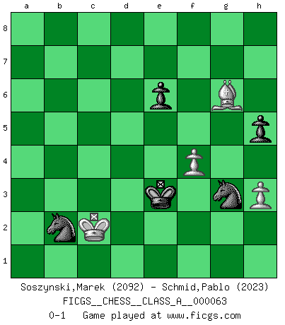 Last move : 0-1 2010 September 16 22:57:25 [Event "FICGS__CHESS__CLASS_A__000063"] [Site "FICGS"] [Date "2009.12.25"] [Round "1"] [White "Soszynski,Marek"] [Black "Schmid,Pablo"] [Result "0-1"] [WhiteElo "2092"] [BlackElo "2023"] 1.e4 e5 2.d4 exd4 3.Qxd4 Nc6 4.Qe3 Nf6 5.e5 Ng4 6.Qe4 d5 7.exd6 Be6 8.Ba6 Qxd6 9.Bxb7 Qb4+ 10.Qxb4 Nxb4 11.Bxa8 Nxc2+ 12.Ke2 Nxa1 13.Bc6+ Kd8 14.b3 Nc2 15.Nf3 Nb4 16.Ba4 Nxa2 17.Bb2 Nf6 18.Rd1+ Kc8 19.Nd4 Bc5 20.Nxe6 fxe6 21.g3 Rd8 22.Rxd8+ Kxd8 23.Nd2 Ke7 24.f4 Bb4 25.Kd3 Bxd2 26.Kxd2 Nb4 27.Bd4 a5 28.Ke2 g6 29.Bc5+ Kd8 30.Bd4 Nd7 31.Kf3 Ke7 32.Bb5 Nd5 33.Kg4 c5 34.Bb2 N7f6+ 35.Kf3 Nb4 36.Be2 Nc2 37.Bd1 Nd4+ 38.Ke3 Nd5+ 39.Kd3 Nf5 40.Be2 Kd7 41.Ke4 Nd6+ 42.Kd3 Kc7 43.Bh8 Nb4+ 44.Kd2 Kc6 45.Ke3 Nd5+ 46.Kf3 Nb6 47.Ke3 a4 48.bxa4 Nxa4 49.Be5 Nb6 50.Kd3 Nd5 51.Kd2 Nf5 52.Bf1 Kb6 53.Be2 Nfe3 54.Bh8 Ka5 55.Be5 Kb4 56.Bh8 c4 57.Be5 Kc5 58.Bg7 h5 59.Bf8+ Kb5 60.Bd6 Ng4 61.h3 Nf2 62.Bf3 c3+ 63.Kc2 Kc4 64.Be2+ Kd4 65.Be5+ Ke3 66.Bb5 Ne4 67.Be8 Nb4+ 68.Kb3 c2 69.Bb2 Nd3 70.Kxc2 Nxb2 71.Bxg6 Nxg3 0-1 Centre game : Berger variation 10 pieces endgame at move 71 : White KBPPP , Black KNNPP WHITE : King + 1 Bishop 3 Pawns BLACK : King + 2 Knights 2 Pawns 9 pieces endgame at move 71 : White KBPP , Black KNNPP WHITE : King + 1 Bishop 2 Pawns BLACK : King + 2 Knights 2 Pawns Player Black won this chess game. Follow this game move after move (download)A Chess game is divided into three stages: the first, when you hope you have the advantage, the second when you believe you have an advantage, and the third... when you know you're going to lose ! (Savielly Tartakower) Im Schach gewinnt jeder. Hat man Freunde am Spiel - und das ist die Hauptsache - ist auch der Verlust einer Partie kein Unglück. (David Bronstein) Una partida de Ajedrez se divide en 3 etapas: la primera cuando piensas que tienes la ventaja, la segunda cuando crees que tienes la ventaja y la tercera... ¡cuando te das cuenta que vas a perder!. (Savielly Tartakower) Pour se monter efficace, un Cavalier a besoin d'avant-postes ! Les Cavaliers font les meilleurs bloqueurs de pions passés. Fame, I have already. Now I need the money. (an elderly Steinitz)
