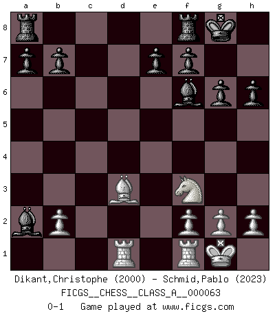 Last move : 0-1 2010 January 15 18:18:58 [Event "FICGS__CHESS__CLASS_A__000063"] [Site "FICGS"] [Date "2009.12.25"] [Round "1"] [White "Dikant,Christophe"] [Black "Schmid,Pablo"] [Result "0-1"] [WhiteElo "2000"] [BlackElo "2023"] 1.d4 Nf6 2.Nf3 g6 3.e3 Bg7 4.Nbd2 d5 5.Bd3 O-O 6.O-O c5 7.c3 Nbd7 8.Qe2 Qc7 9.e4 cxd4 10.cxd4 dxe4 11.Nxe4 Nxe4 12.Qxe4 Nf6 13.Qh4 Be6 14.Bf4 Qb6 15.Be5 Bd5 16.Ng5 h6 17.Bxf6 Qxf6 18.Nf3 Qxh4 19.Nxh4 Bxd4 20.Rad1 Bf6 21.Nf3 Bxa2 0-1 King's Indian : East Indian defense Kingside Castling by player Black (move 5) Kingside Castling by player White (move 6) Player Black won this chess game. Follow this game move after move (download)When I asked Fischer why he had not played a certain move in our game, he replied: 'Well, you laughed when I wrote it down !' (Mikhail Tal) Darum geht es im Schach. Einen Tag gibst du deinem Gegner eine Lektion, am nächsten Tag gibt er dir eine. (Robert James Fischer) Un Peón pasado es un criminal, quién debe ser mantenido bajo candado y llave. Leves medidas, tales como vigilancia policiaca, no son suficientes. (Aaron Nimzovich) Les échecs, c'est l'imagination. (David Bronstein) Political correctness is subjecting us to gross incompetence. (Johann Piek)