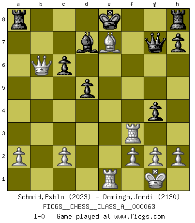 Last move : 1-0 2010 March 30 19:11:24 [Event "FICGS__CHESS__CLASS_A__000063"] [Site "FICGS"] [Date "2009.12.25"] [Round "1"] [White "Schmid,Pablo"] [Black "Domingo,Jordi"] [Result "1-0"] [WhiteElo "2023"] [BlackElo "2130"] 1.e4 e5 2.Nf3 f5 3.Nxe5 Qf6 4.Nc4 fxe4 5.Nc3 Qf7 6.Ne3 c6 7.d3 exd3 8.Bxd3 d5 9.O-O Bc5 10.b4 Bd6 11.Re1 Ne7 12.Nexd5 cxd5 13.Nb5 Bxb4 14.Rb1 a6 15.Rxb4 axb5 16.Rf4 Qg8 17.Bxb5+ Nbc6 18.Qd4 Bd7 19.Qb6 g5 20.Bxc6 bxc6 21.Ba3 Qg7 22.Rf3 g4 23.Bxe7 1-0 Latvian counter-gambit Kingside Castling by player White (move 9) Player White won this chess game. Follow this game move after move (download)What would Chess be without silly mistakes ? (Kurt Richter) Schach ist mein Leben, meine Leidenschaft, was ich gelernt habe und seit meinem 14. Lebensjahr profimässig praktiziere. Darauf zu verzichten, würde mir sehr schwer fallen. (Viktor Kortschnoi) El Ajedrez es una hermosa aventura. (Bent Larsen) En blitz, le Cavalier l'emporte sur le Fou. (Vlastimil Hort) A good teacher is like a candle - it consumes itself to light the way for others. (Author unknown)