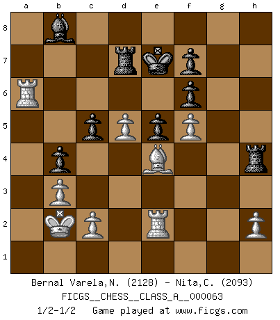Last move : 1/2-1/2 2010 April 25 5:5:27 [Event "FICGS__CHESS__CLASS_A__000063"] [Site "FICGS"] [Date "2009.12.25"] [Round "1"] [White "Bernal Varela,Nelson"] [Black "Nita,Catalin"] [Result "1/2-1/2"] [WhiteElo "2128"] [BlackElo "2093"] 1.e4 c5 2.Nf3 Nc6 3.d4 cxd4 4.Nxd4 Nf6 5.Nc3 d6 6.Bg5 e6 7.Qd2 a6 8.O-O-O Bd7 9.f4 b5 10.Bxf6 gxf6 11.Kb1 b4 12.Nce2 Qb6 13.Qd3 Rc8 14.f5 Nxd4 15.Nxd4 e5 16.Nb3 a5 17.Nd2 Qc5 18.Be2 a4 19.Nc4 Rg8 20.g3 Bc6 21.Rhe1 Be7 22.Bf1 Kf8 23.Qe3 Rg4 24.Qxc5 dxc5 25.Bg2 Rg8 26.Nb6 Rd8 27.Kc1 Kg7 28.Nd5 Kf8 29.b3 axb3 30.axb3 h5 31.Bf3 Bxd5 32.exd5 Rg5 33.Be4 h4 34.gxh4 Rh5 35.Kb2 Rxh4 36.Re2 Bd6 37.Ra1 Ke7 38.Ra7+ Rd7 39.Ra6 Bb8 40.Ra5 Kd6 41.Ra6+ Ke7 1/2-1/2 Sicilian defense Queenside Castling by player White (move 8) This chess game ended in a draw. Follow this game move after move (download)Not all artists are Chess players, but all Chess players are artists. (Marcel Duchamp) Lisa Lane, amerikanische Schachmeisterin, hatte Fischer einmal als stärksten lebenden Spieler bezeichnet. Antwort: Das ist richtig, aber Lisa Lane ist eigentlich nicht in der Lage, das zu beurteilen. (Robert James Fischer) Ciertamente, de todas la drogas del mundo, el Ajedrez debe ser el mas placentero permamentemente. (Assiac) Roi des jeux et jeu des rois, les échecs portent en eux un sentiment d'infini. Ils donnent à celui qui s'est efforcé d'en approfondir les arcanes l'impression de n'être pas à la mesure de l'homme; en fait, ils constituent un résumé de l'univers, un microcosme, et figurent cette grande échelle qui, dans les plans de la lumière descend jusqu'à la matière, qui des abîmes insondables remonte jusqu'en l'infini de Dieu. (Pyrame) You must have a dream in order to have it come true. (A.P.J. Kalam)