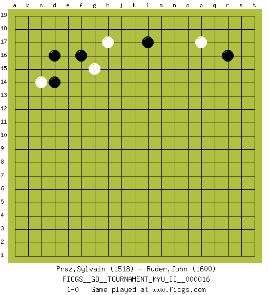 Last move : 1-0 2010 January 31 20:41:41 [Event "FICGS__GO__TOURNAMENT_KYU_II__000016 "] [Site "FICGS"] [Date "2009.12.26"] [Round "1"] [Black "Praz,Sylvain "] [White "Ruder,John "] [Result "1-0"] [Rating 1 "1518"] [Rating 2 "1600"] 1.r16 p17 2.d16 c14 3.f16 h17 4.l17 g15 5.d14 1-0 This go game has been lost on time (started : 2009.12.26 10:2:27) Here are the names of the openings (joseki) played in the four corners : Corner q16 : r16 p17Komoku (Somok, Xiao~mu`) 3-4 Point. The komoku (3-4) point is the traditional corner enclosure move..Ikken Kakari (Hankan Keolch'im, Yi Gua`jiao~, 1-Space Low Pincer). The small knight move is the basic approach move to the 3-4 point stone. It has been continually used for over four centuries. There are limitless variations, with new moves constantly being discovered. White 2 opens the door to a treaure store of joseki. Corner d16 : d16 c14Hoshi (Hwajeom, Seongjeom, Xingwei`) 4-4 Point. The star or hoshi (4-4) point, emphasizing influence at the potential expense of territory.Ikken Kakari (Hankan Keolch'im, Yi Gua`jiao~, 1-Space Low Approach). White 2 is the standard approach move to the 4-4. Player Black won this Go (weiqi, baduk) game.Follow this game move after move (download ) Keep sente in the opening. A premature attack loses sente. (Anonymous) I'm extremely disappointed. I send you out for exciting, new designer drugs, you come back with tomato sauce. (Gregory House, House M.D.)