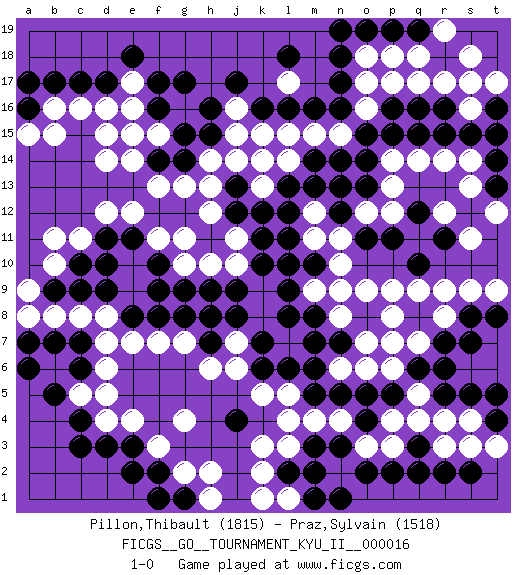 Last move : 1-0 2010 February 16 12:43:6 [Event "FICGS__GO__TOURNAMENT_KYU_II__000016"] [Site "FICGS"] [Date "2009.12.26"] [Round "1"] [Black "Pillon,Thibault"] [White "Praz,Sylvain"] [Result "1-0"] [Rating 1 "1815"] [Rating 2 "1518"] 1.q16 d16 2.q3 q5 3.c4 e4 4.e3 f3 5.d3 g4 6.c6 l3 7.o4 r3 8.r2 r4 9.p2 r9 10.s2 r14 11.n17 r17 12.r16 s16 13.s15 s18 14.t16 s17 15.r15 p17 16.p16 o17 17.n16 o16 18.o15 n15 19.j17 m15 20.n18 q17 21.o14 q14 22.p15 r12 23.q19 r19 24.o11 l17 25.m16 l15 26.l16 k15 27.k16 j15 28.r7 q7 29.q8 r8 30.q6 p7 31.r5 p6 32.r6 q4 33.s5 s4 34.t4 t3 35.t5 s3 36.p5 p4 37.o5 p3 38.q2 p9 39.q10 q9 40.r11 s11 41.q12 s13 42.l12 p13 43.o13 p12 44.p11 o12 45.n12 n13 46.n14 n11 47.m13 n10 48.l10 c11 49.f17 f15 50.g15 g16 51.h16 h14 52.g14 h12 53.c17 c16 54.d17 e16 55.g17 g13 56.f14 d14 57.c9 m9 58.l9 f13 59.j4 j6 60.l8 l5 61.h8 g7 62.g8 f7 63.f8 e7 64.e8 d7 65.c7 d8 66.d9 e14 67.h15 j16 68.f16 j14 69.o19 q18 70.k6 k5 71.e11 e12 72.d11 d12 73.h7 h6 74.k7 b10 75.b17 b16 76.o8 p8 77.m8 o9 78.a16 a15 79.a17 b15 80.b9 m11 81.l11 m12 82.l13 n13 83.m14 h10 84.c10 b11 85.f2 g2 86.e2 d5 87.s8 s9 88.t8 t9 89.s7 f11 90.g1 h1 91.f1 h2 92.n3 c5 93.b5 c8 94.b7 n2 95.m2 o3 96.m3 n4 97.n5 m4 98.m5 l4 99.l2 k2 100.o2 k3 101.p19 t17 102.t15 e10 103.d10 d4 104.c3 l1 105.n1 e9 106.f10 b8 107.f9 g10 108.j9 e17 109.e18 a8 110.a7 d6 111.a6 n8 112.j13 h13 113.n7 o7 114.l6 n6 115.m7 j10 116.j12 j11 117.k11 j7 118.j8 k13 119.k12 k14 120.e15 d15 121.k10 o6 122.m6 k1 123.m1 o18 124.l18 a9 125.m10 n9 126.t13 t12 127.t14 p18 128.n19 p14 129.n12 f15 130.n13 e15 131.g9 s14 132.h9 g11 133.q15 l14 134.pass 1-0 Here are the names of the openings (joseki) played in the four corners : Corner q4 : q3 q5 Komoku (Somok, Xiao~mu`) 3-4 Point. The komoku (3-4) point is the traditional corner enclosure move.. Ikken Takagakari (Hankan Nop'dakeolch'im, Yi Gaogua`jiao~, 1-Space High Approach). The 5-4 approach move has become more popular in modern times, as modern Go emphasizes speed and influence. Corner d4 : c4 e4 Komoku (Somok, Xiao~mu`) 3-4 Point. The komoku (3-4) point is the traditional corner enclosure move.. Ikken Takagakari (Hankan Nop'dakeolch'im, Yi Gaogua`jiao~, 1-Space High Approach). The 5-4 approach move has become more popular in modern times, as modern Go emphasizes speed and influence. Corner q16 : q16 r14 Hoshi (Hwajeom, Seongjeom, Xingwei`) 4-4 Point. The star or hoshi (4-4) point, emphasizing influence at the potential expense of territory. Ikken Kakari (Hankan Keolch'im, Yi Gua`jiao~, 1-Space Low Approach). White 2 is the standard approach move to the 4-4. Corner d16 : d16 j17 Hoshi (Hwajeom, Seongjeom, Xingwei`) 4-4 Point. The star or hoshi (4-4) point, emphasizing influence at the potential expense of territory. Player Black won this Go (weiqi, baduk) game. Follow this game move after move (download)Error is one of the sources of transformation. (Pierre Audouard) History is a gallery of pictures in which there are few originals and many copies. (Alexis de Tocqueville)