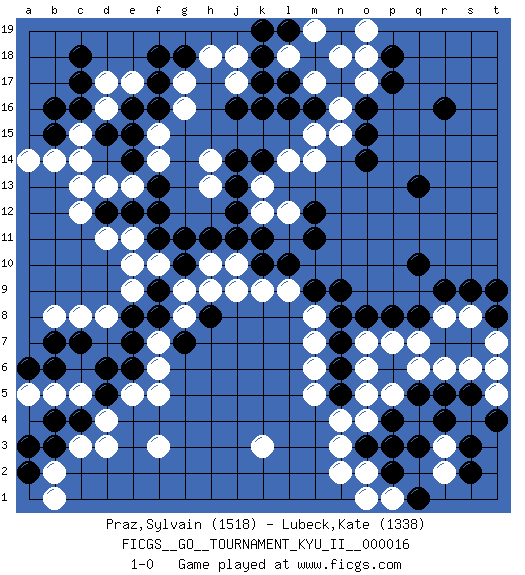 Last move : 1-0 2010 April 10 1:36:48 [Event "FICGS__GO__TOURNAMENT_KYU_II__000016"] [Site "FICGS"] [Date "2009.12.26"] [Round "1"] [Black "Praz,Sylvain"] [White "Lubeck,Kate"] [Result "1-0"] [Rating 1 "1518"] [Rating 2 "1338"] 1.r16 d16 2.q3 d4 3.f17 e17 4.f16 c13 5.k16 d8 6.q10 k3 7.p17 n4 8.r5 f3 9.d15 c15 10.c17 d17 11.e15 p5 12.c16 c14 13.c18 q7 14.p6 q6 15.q5 o5 16.e12 d11 17.q8 o7 18.p8 p7 19.n9 m8 20.m9 l9 21.n8 m7 22.l10 k9 23.k10 j10 24.j11 h10 25.h11 f10 26.g11 e11 27.g10 g9 28.f11 e9 29.d12 c12 30.q13 e13 31.f13 d13 32.f12 f14 33.e14 f15 34.e16 h14 35.b4 c3 36.c7 c8 37.b7 b8 38.b3 b2 39.c4 d3 40.a2 b1 41.d5 e5 42.d6 a5 43.a6 b5 44.e6 f5 45.f8 g8 46.f9 e10 47.g7 j9 48.h8 h9 49.e8 f7 50.e7 f6 51.a3 c5 52.b6 r8 53.r9 s8 54.s9 s6 55.o3 n3 56.s5 r6 57.p4 o2 58.p2 n2 59.n7 m6 60.n6 o6 61.n5 m5 62.o8 m14 63.m11 m17 64.k18 g16 65.k14 g17 66.f18 j17 67.k17 j18 68.g18 h18 69.j16 o18 70.p18 o17 71.o16 n16 72.o15 l18 73.k19 n18 74.l19 m19 75.l17 o19 76.m16 m15 77.l16 n15 78.o14 k12 79.k11 l12 80.j13 k13 81.j14 l14 82.m12 h13 83.j12 o4 84.p3 r3 85.s3 r2 86.r4 p1 87.q1 o1 88.s2 t5 89.t4 t6 90.b15 b14 91.b16 a14 92.t8 t7 93.t9 1-0 Here are the names of the openings (joseki) played in the four corners : Corner d16 : d16 f17 Hoshi (Hwajeom, Seongjeom, Xingwei`) 4-4 Point. The star or hoshi (4-4) point, emphasizing influence at the potential expense of territory. Ikken Kakari (Hankan Keolch'im, Yi Gua`jiao~, 1-Space Low Approach). Black 2 is the standard approach move to the 4-4. Corner q4 : q3 n4 Komoku (Somok, Xiao~mu`) 3-4 Point. The komoku (3-4) point is the traditional corner enclosure move.. Player Black won this Go (weiqi, baduk) game. Follow this game move after move (download)Everything happens on a grid-engraved board with black and white pieces, but if that's all you see then you don't know Go. (Pierre Audouard) The only thing that overcomes hard luck is hard work. (Harry Golden)